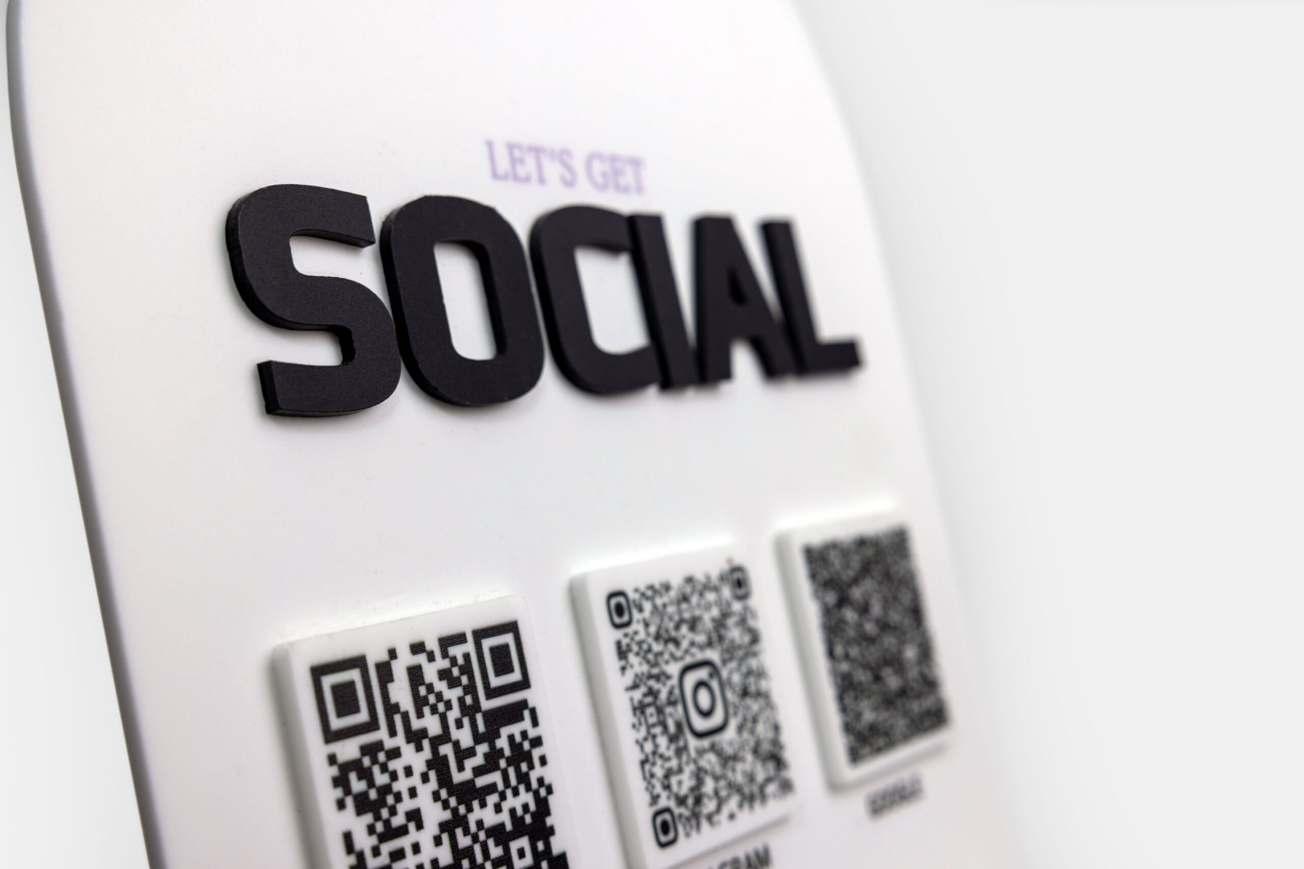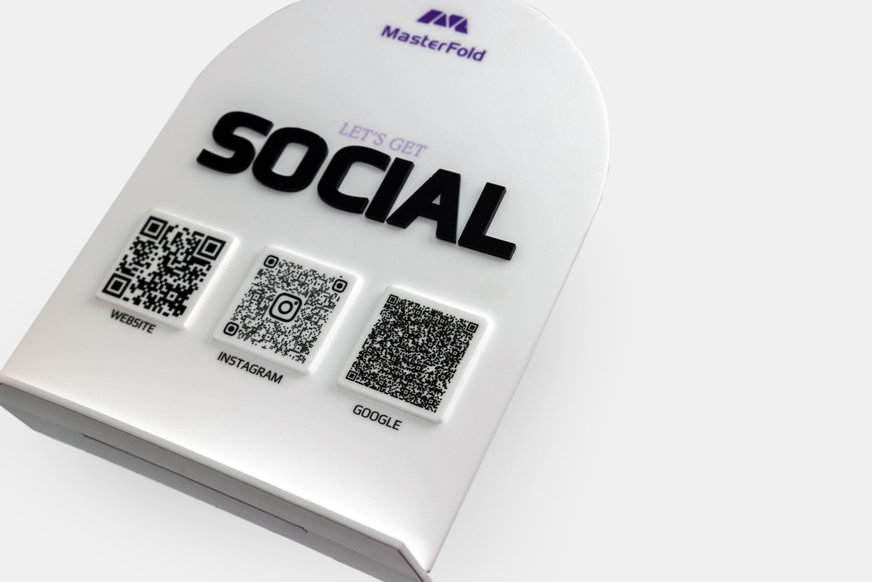 Crafted from lightweight white acrylic in a gate-like shape. The base can be easily attached or removed for storage. Modern and minimal, with enough space to display more than one QR code along with your message.