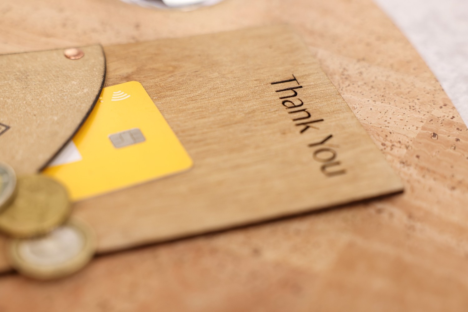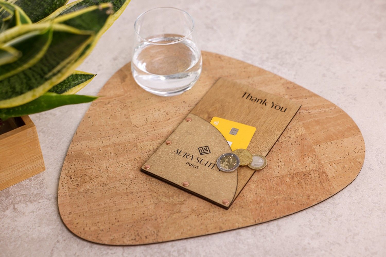 A wooden board bill folder with an exterior pocket made from recycled leather. It keeps the bill visible and easy to reach, while holding it securely in place.