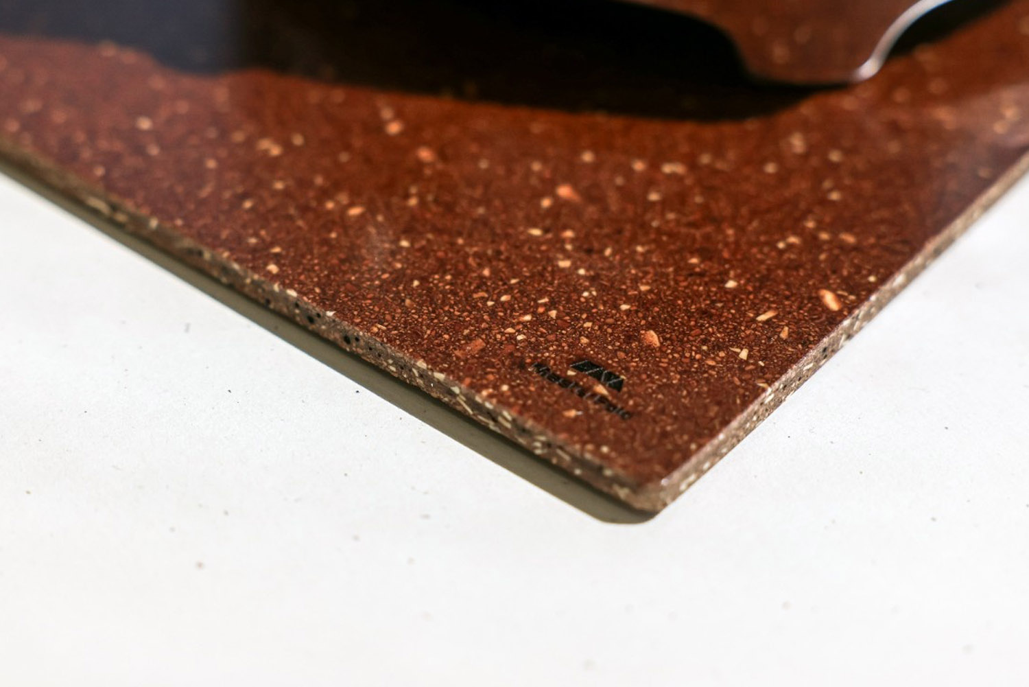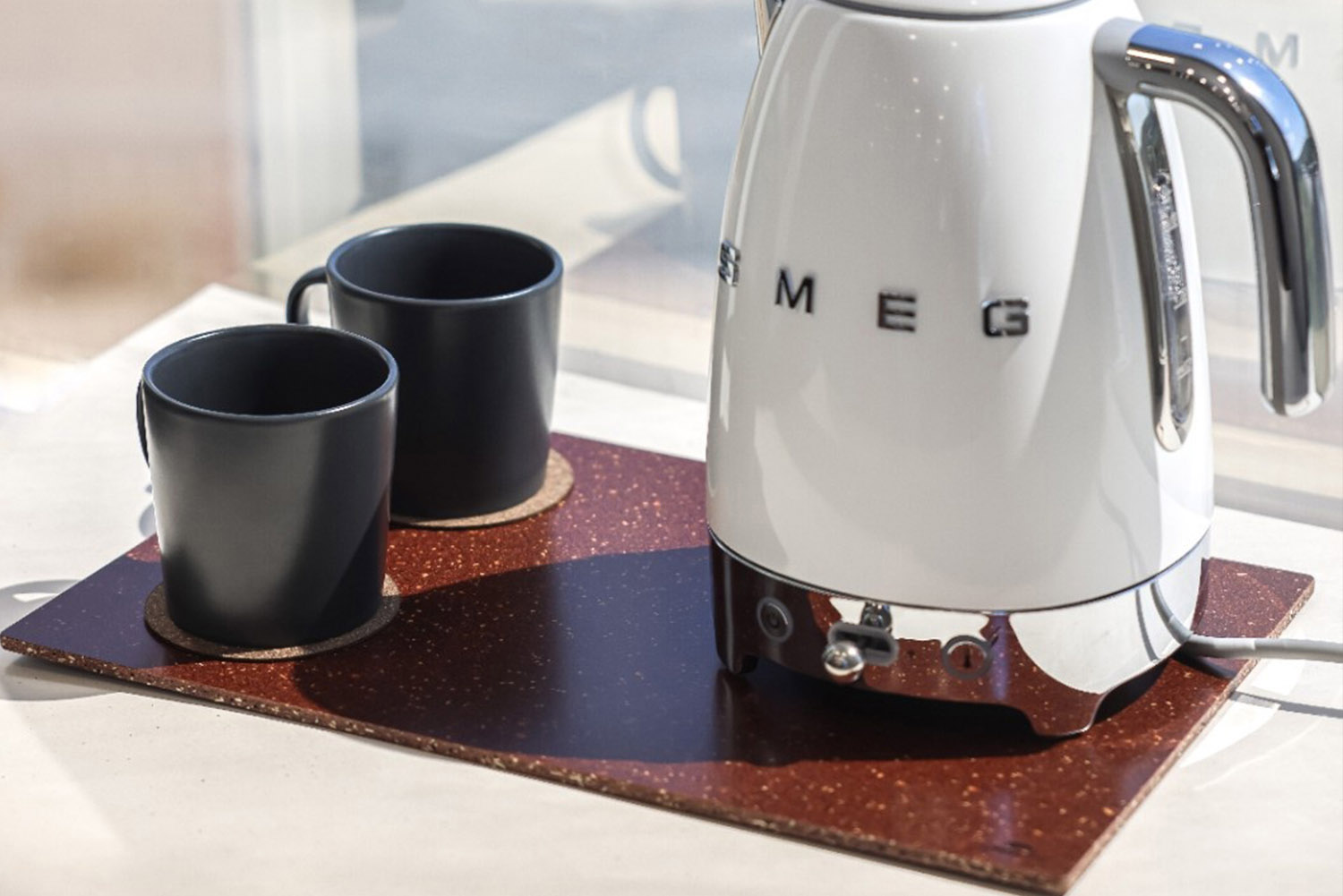 A sustainable coffee tray created from hazelnut and pistachio shells. Its surface has a warm, marble-like feel in soft coffee tones. Food-safe, waterproof and easy to clean, it is designed to hold kettles, cups and coffee amenities.