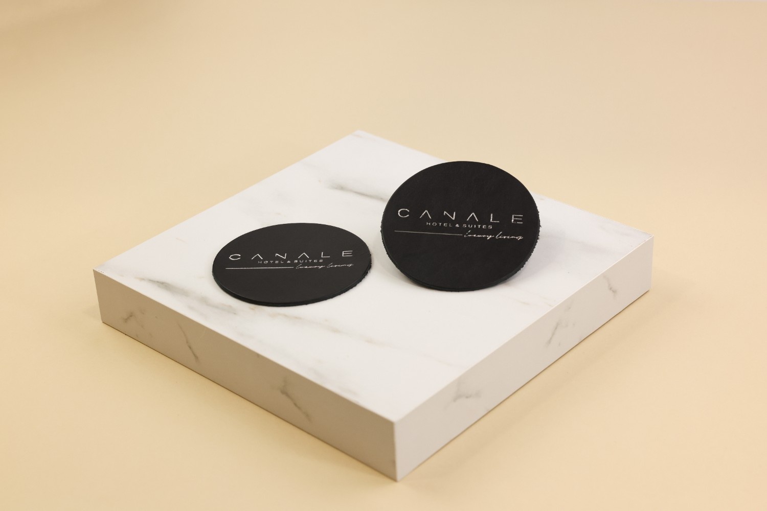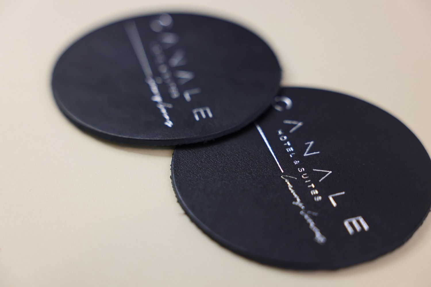Crafted in a circular shape with a more robust feel, this coaster is a bold addition to our classic leather line. The silver foil logo adds striking contrast against the deep black leather.