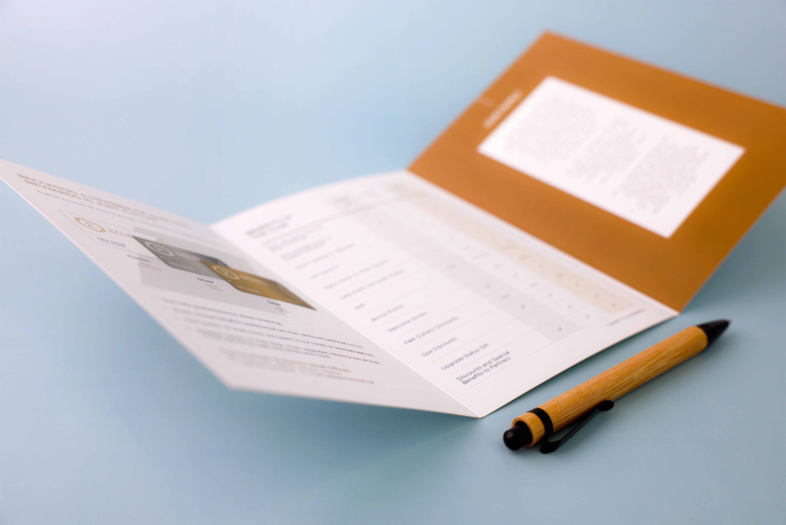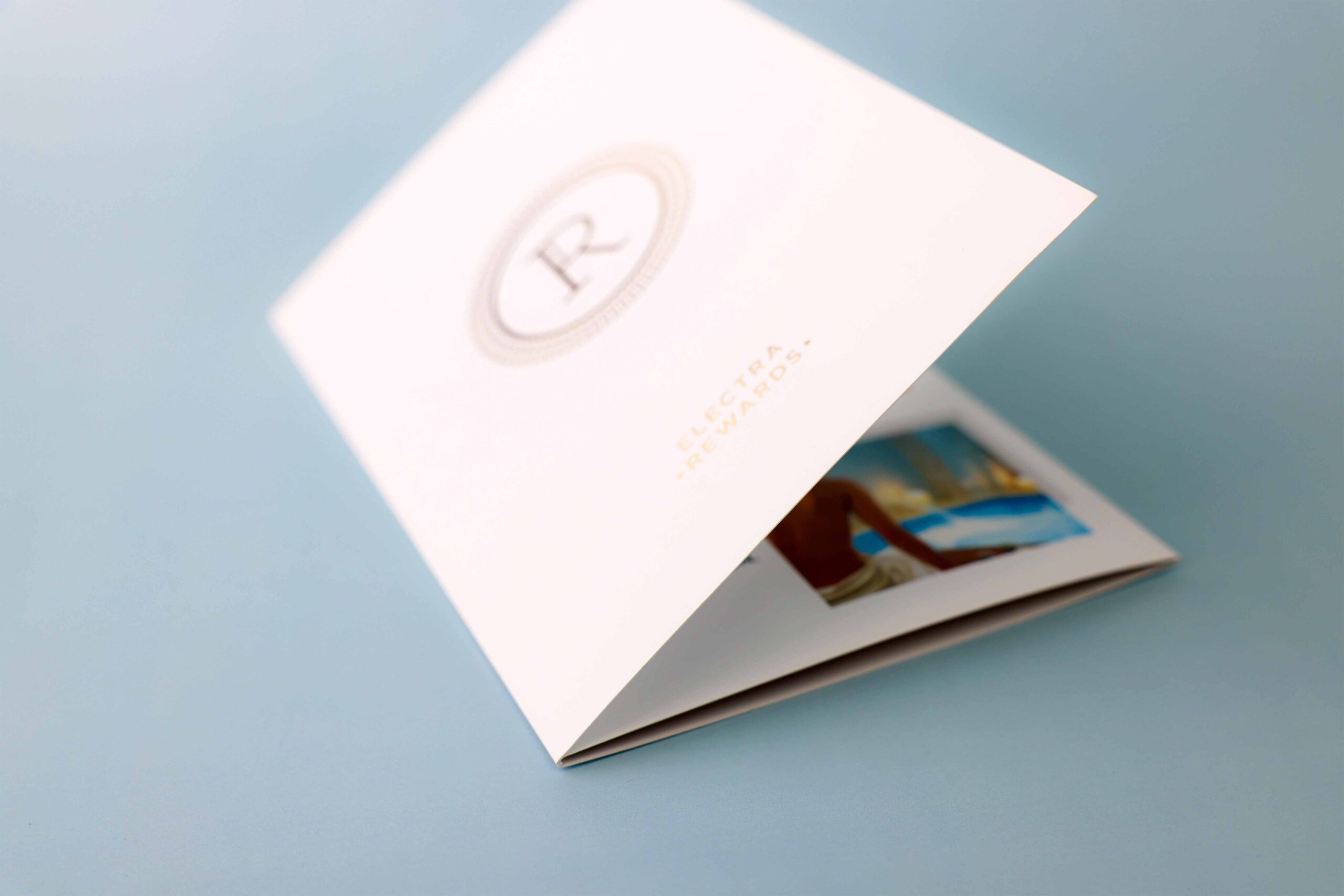 3-fold leaflet crafted from 250 gsm velvet paper and decorated with gold details for a luxurious result. Soft to the touch and visually striking, it’s the perfect choice for promotional pieces where elegance and impact matter.