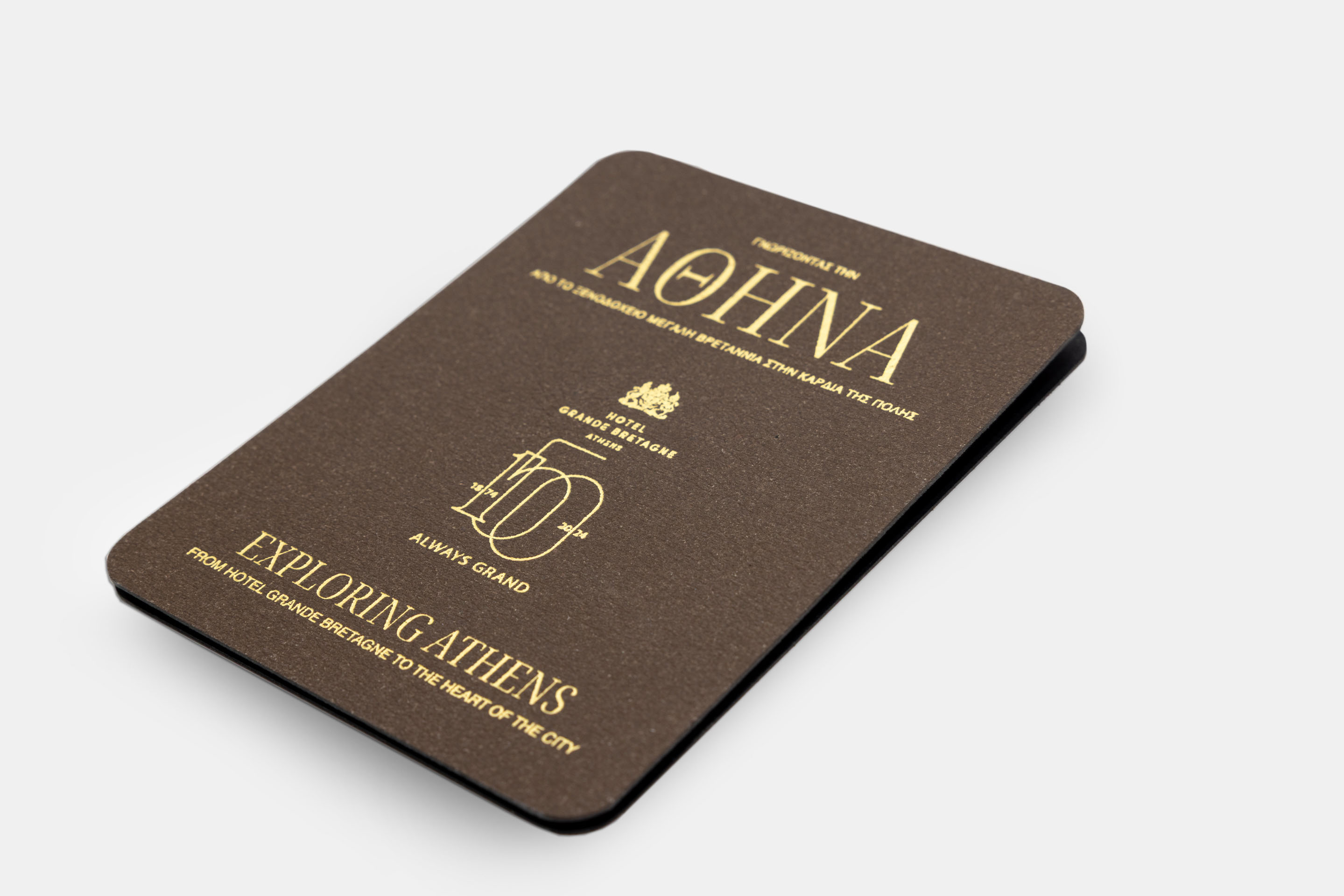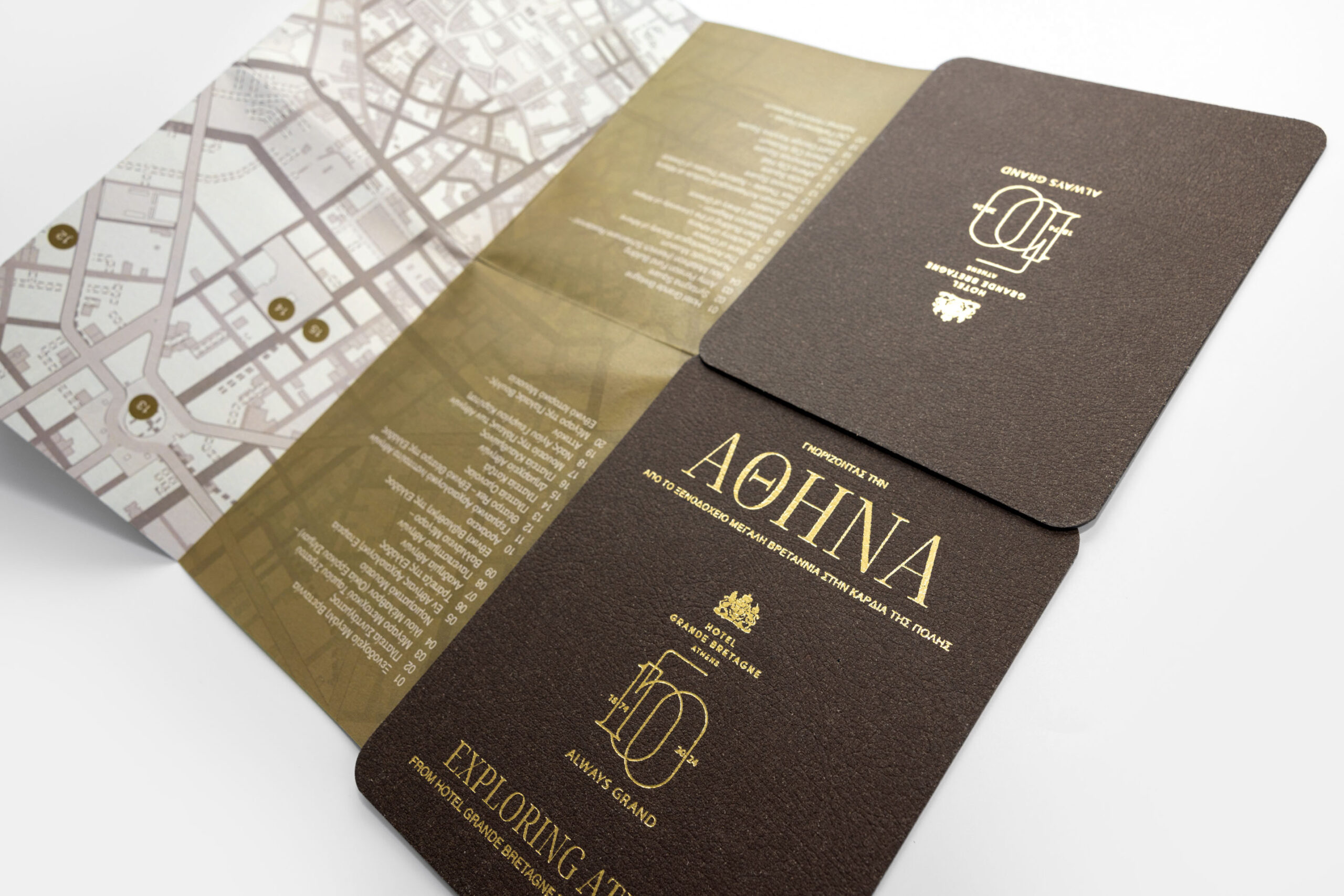 A custom design in a K format for the Grande Bretagne Hotel, inviting visitors to explore the heart of Athens. For the cover, we selected recycled leather in a warm brown tone and combined it with gold foil imprint for contrast. Inside, Sirio Pearl paper with its subtle shine completes the result.