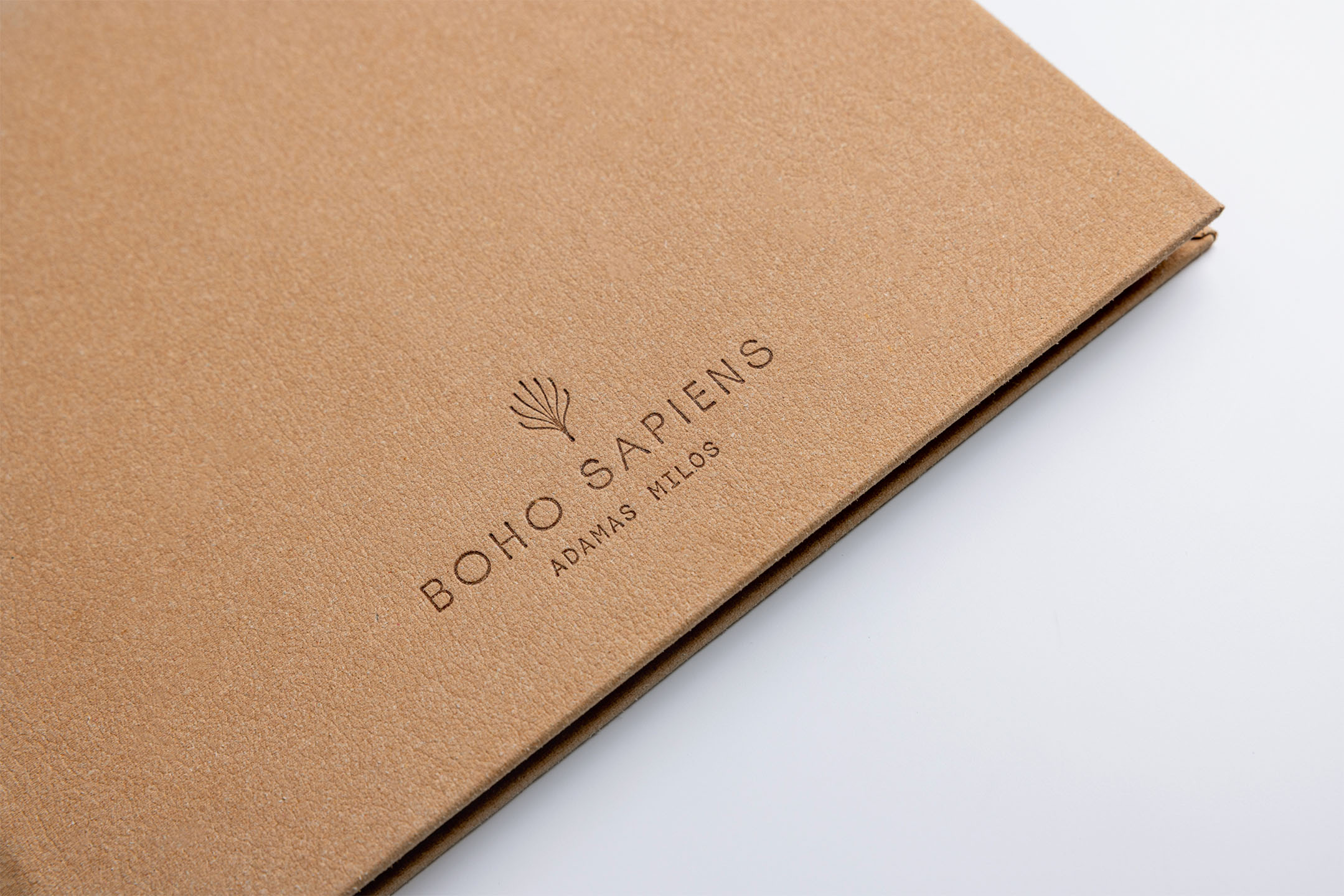 Dressed in simplicity and guided by a minimal aesthetic, this guest folder was created for Boho Sapiens in Milos. It’s crafted from beige recycled leather while two practical pockets hold all the essential information for guests. A folder that balances functionality with understated style, perfectly aligned with the philosophy of Boho Sapiens.