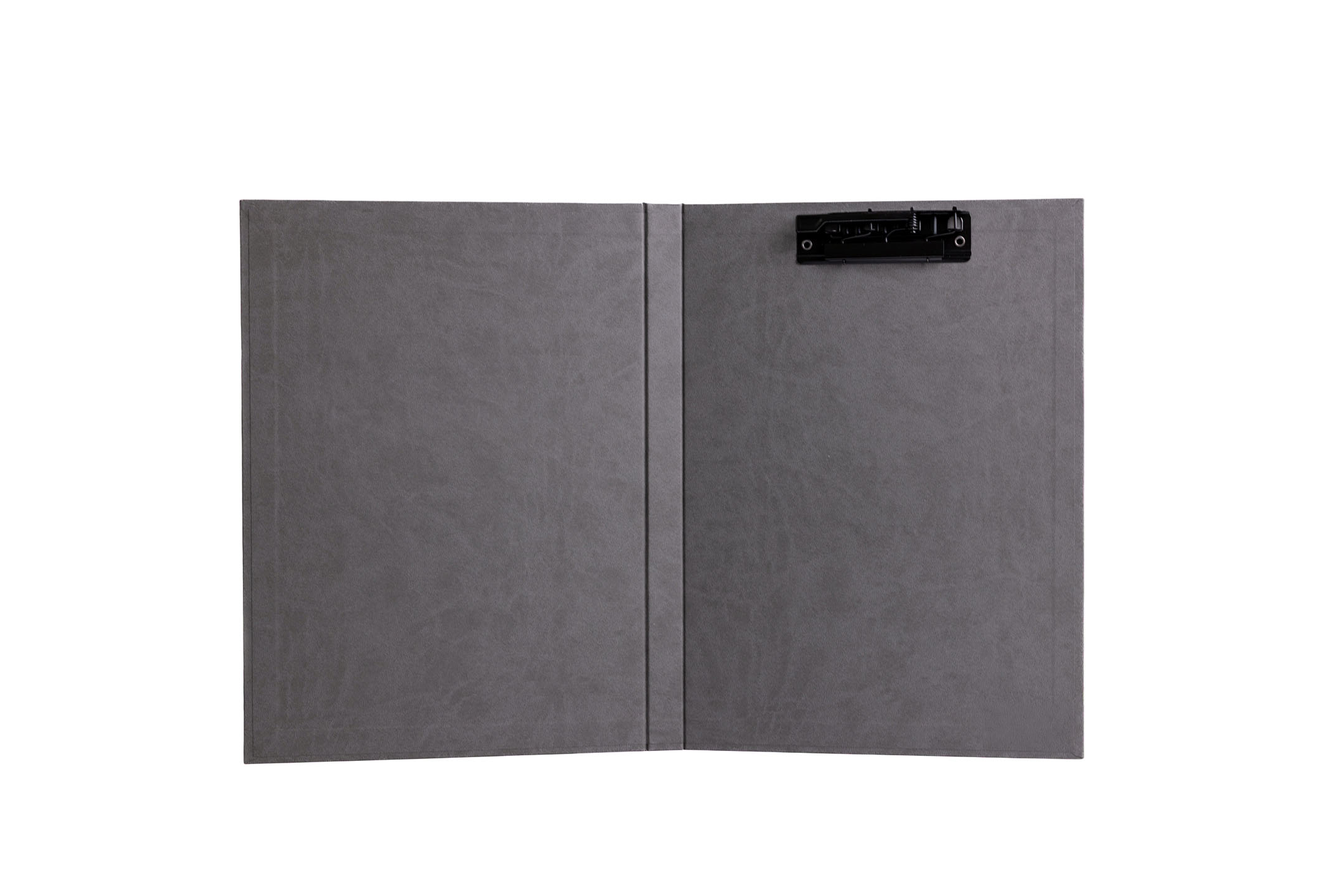 A hard-format A4 guest folder crafted from dark grey binding paper, designed to withstand stains and spills while maintaining a refined look. Inside, a black clipboard secures the pages firmly, keeping information in place for daily use. Durable and practical, yet elegant enough to fit into any hospitality setting.