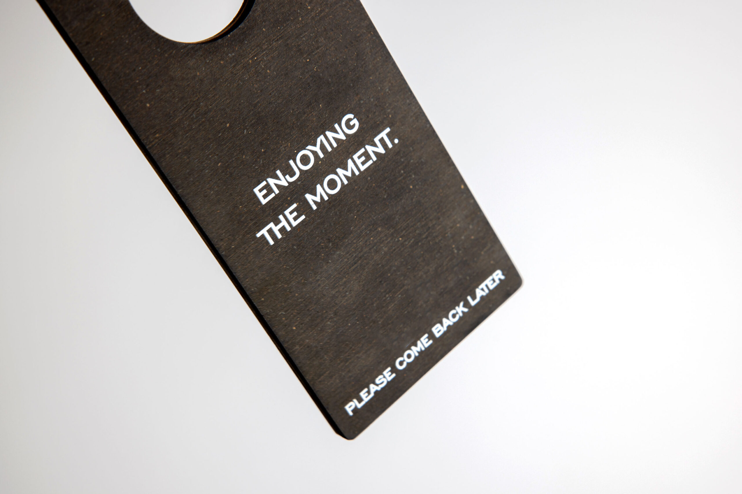 Exploring the potential of sustainable materials, we designed this door hanger by combining two natural boards: wood and coffee. The result is a thick hanger that feels sturdy in hand. Its earthy tones and raw texture create a unique balance of sustainability and design.