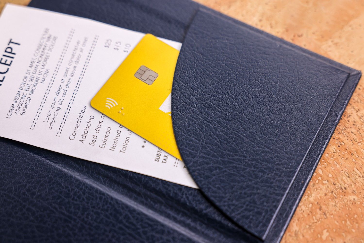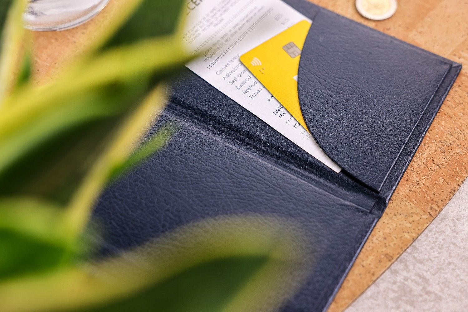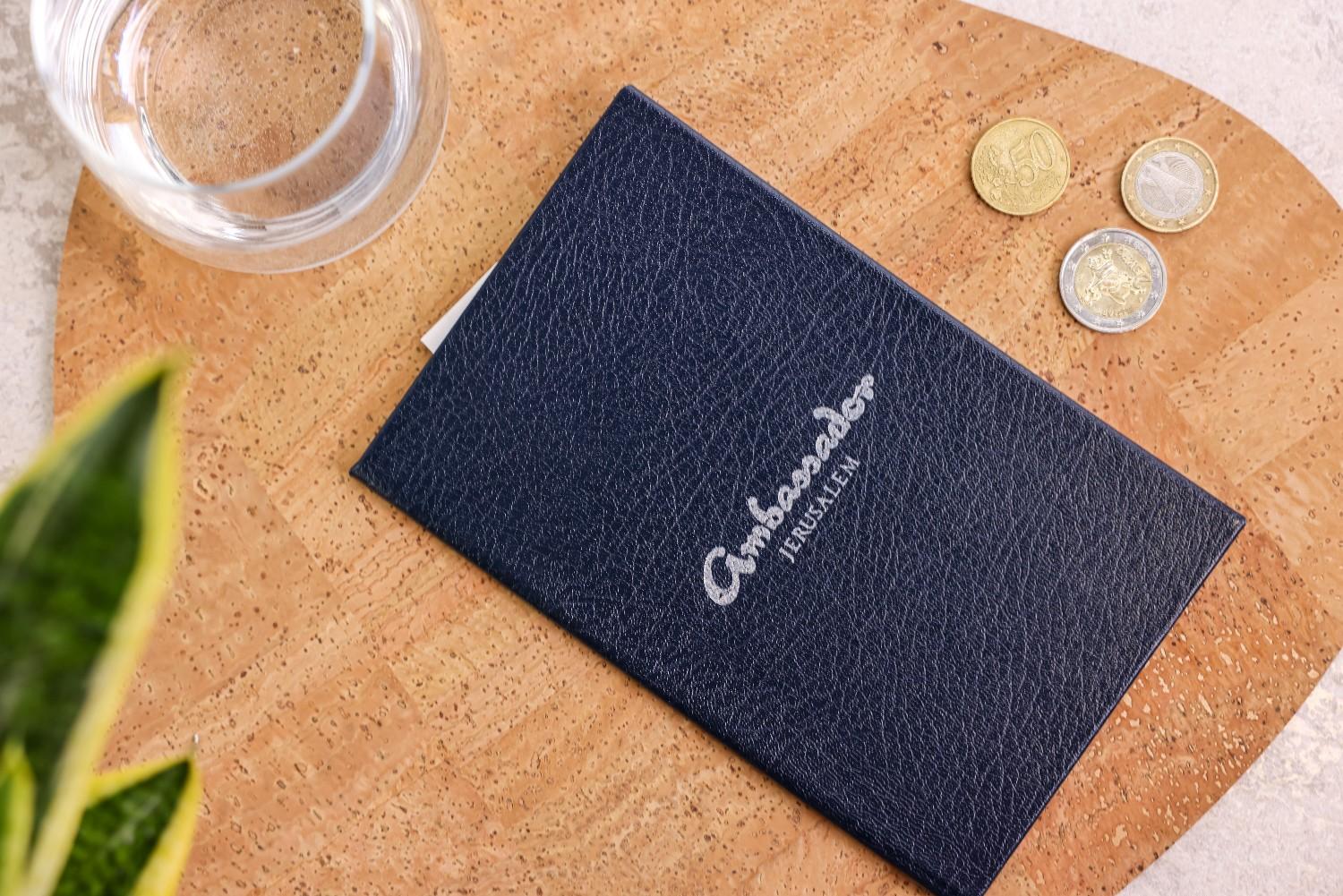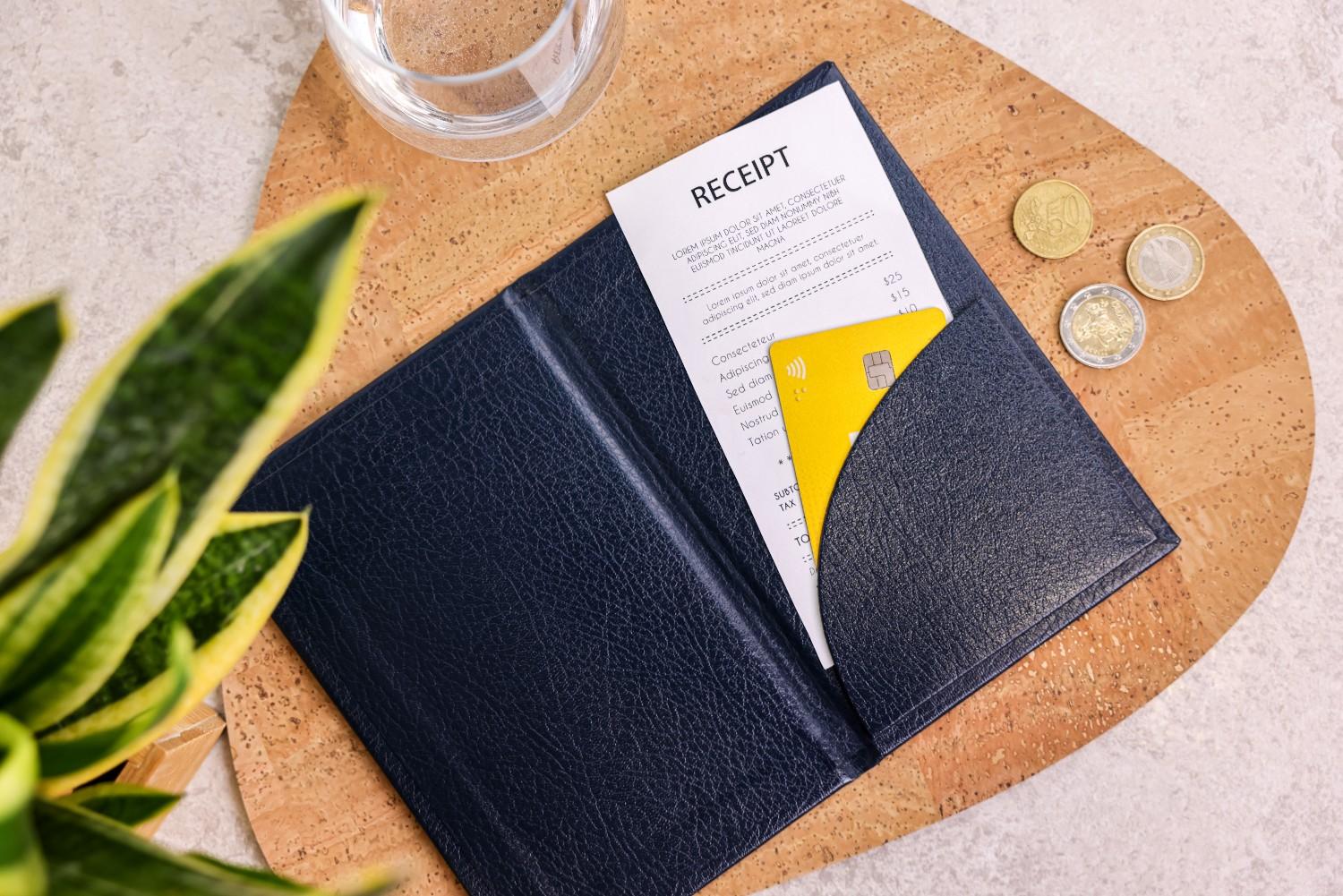 Wrapped in shiny, textured recycled leather in deep navy blue and decorated with iridescent foil, this is the perfect bill folder for elegant dining settings.