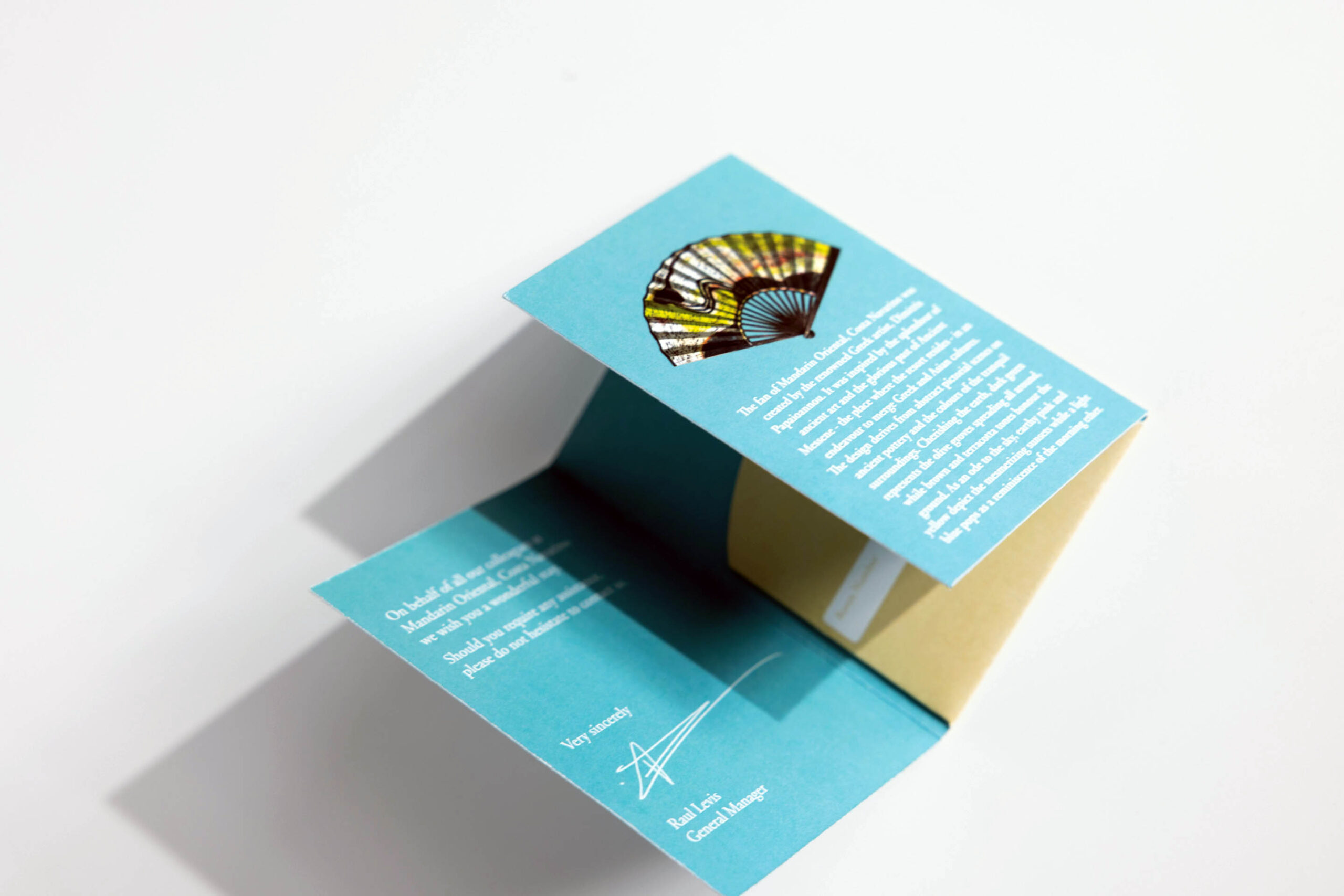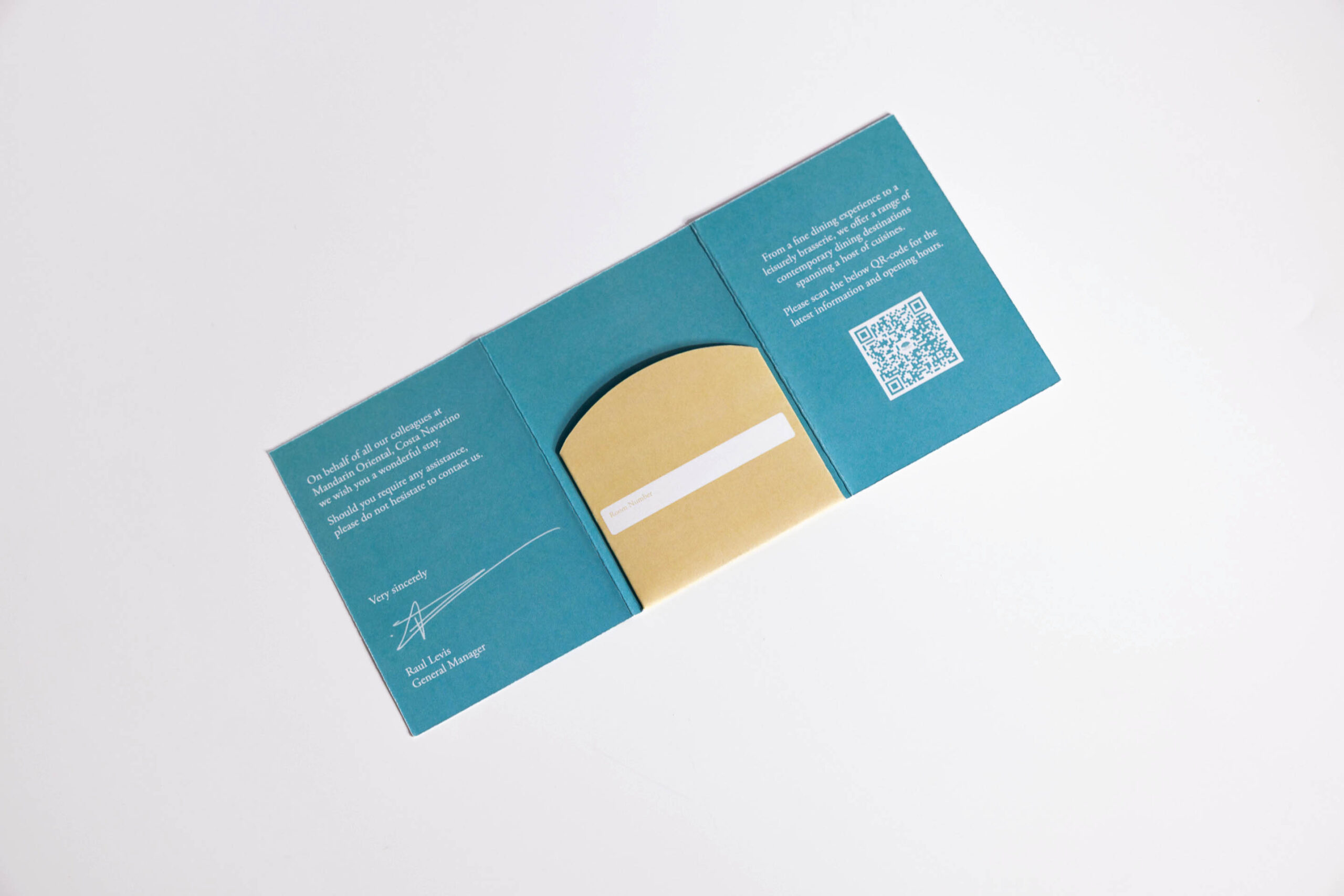 Our newest addition to the key card folder collection, designed for Mandarin Oriental. Crafted from standard paper and decorated with the distinctive colors and patterns of this globally renowned brand. As you open it, a curved sleeve in the center keeps the key card securely in place.