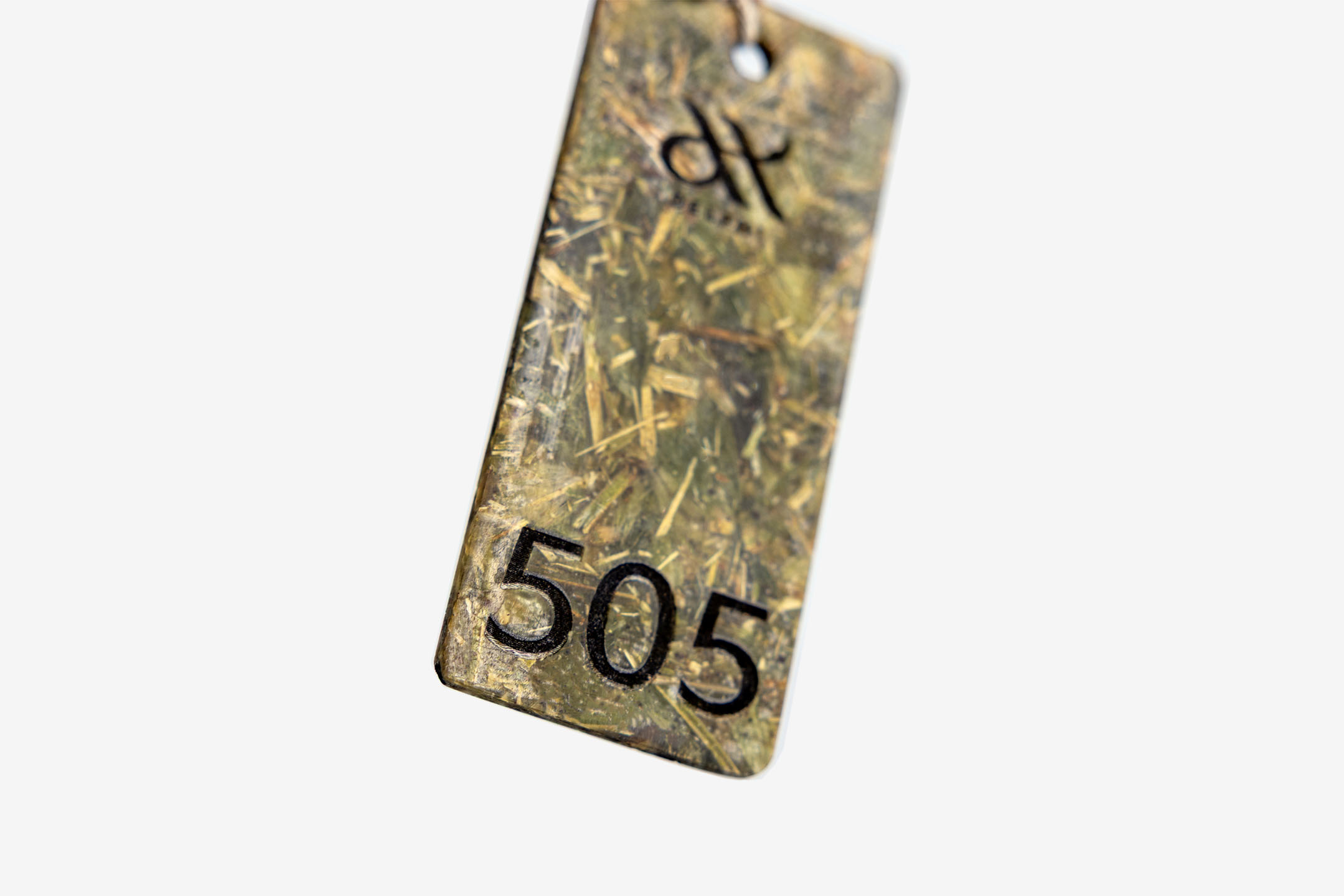 A key ring crafted from a distinctive natural board made of used tea leaves, creating a sustainable, nature-inspired item that your guests will keep with them throughout their stay at your hotel. Finished with a white rope, it is easy to carry and hold.