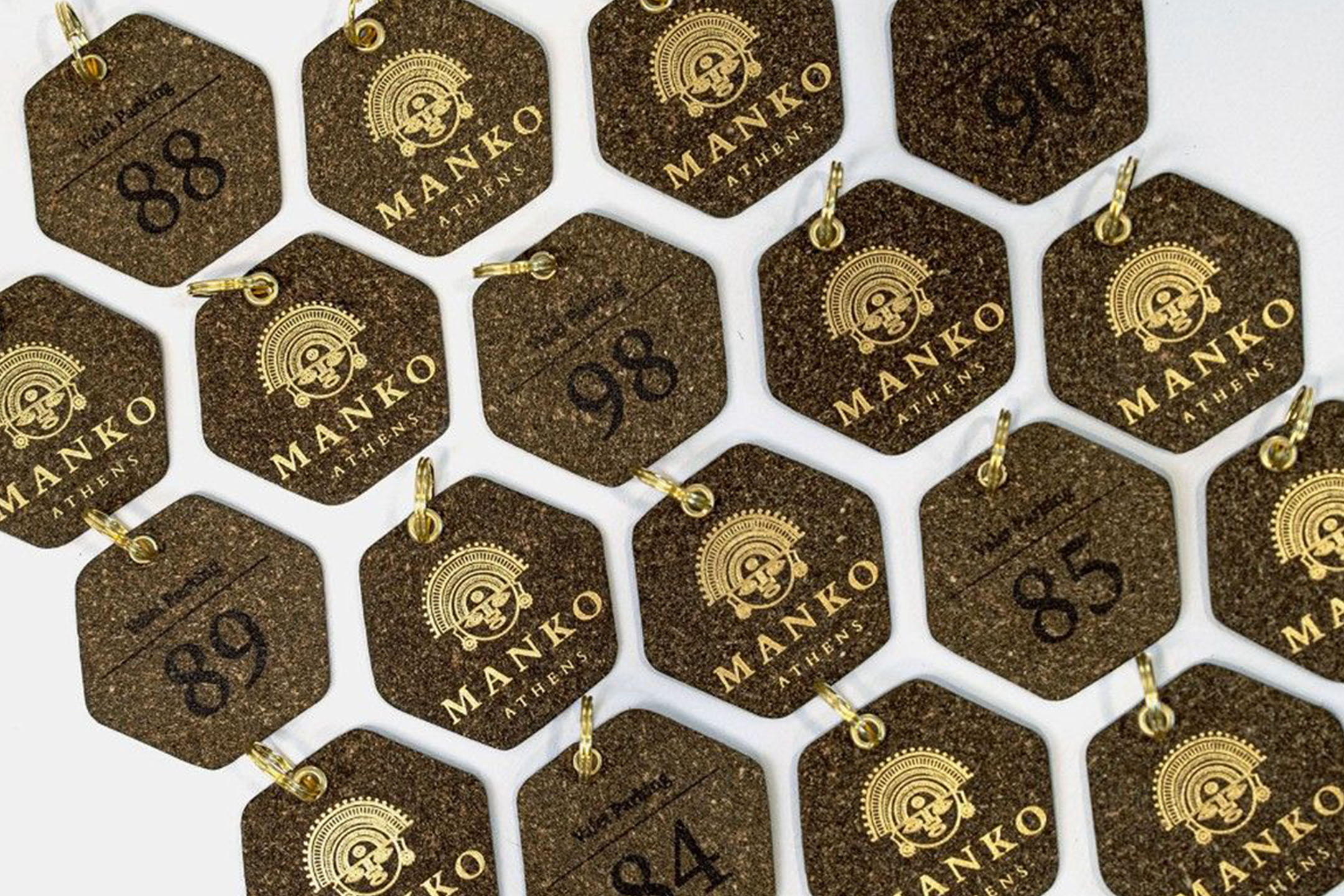 Originally crafted for valet parking for Manko Athens, this piece was later adapted as a key ring for hotels. The combination of recycled brown leather with gold foil creates a bold look.