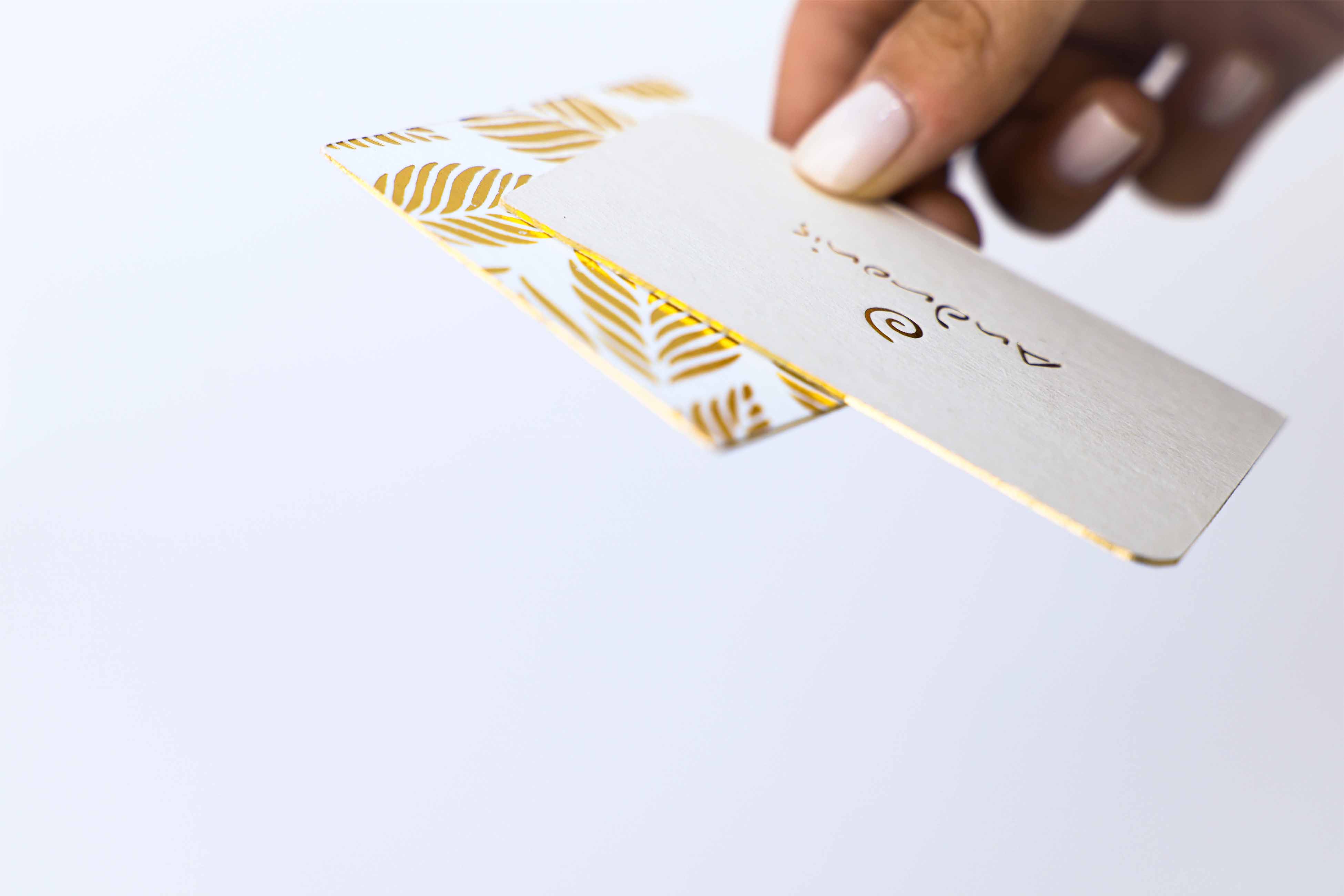 A celebration of typography. Printed on 1.5 mm beermat board, this card presents gold details on both sides and along the edges. It offers a tactile experience and a visually pleasing statement. The reverse side features a gold-printed leaf pattern that catches the light like a jewel. This card shares your information and reflects your taste and attention to detail.