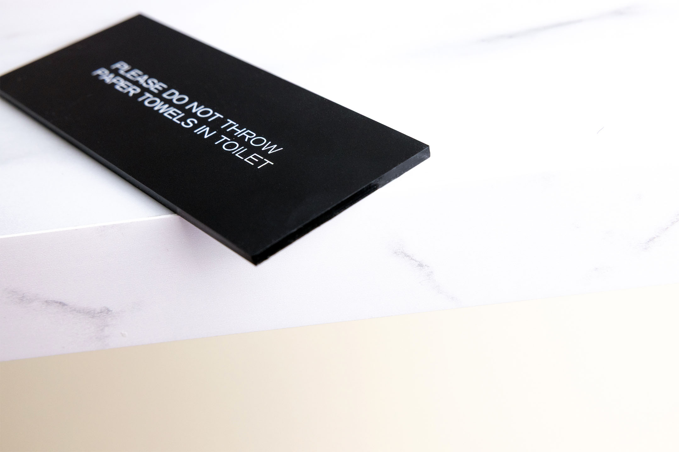 A durable messaging sign made from acrylic, designed to last. Its clean look ensures your message stands out in any space. Place it in a visible area of the room to combine practicality with branding.