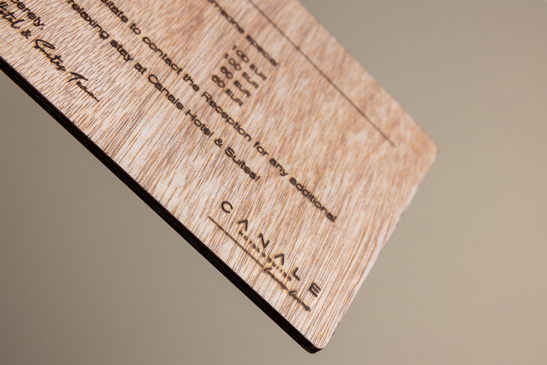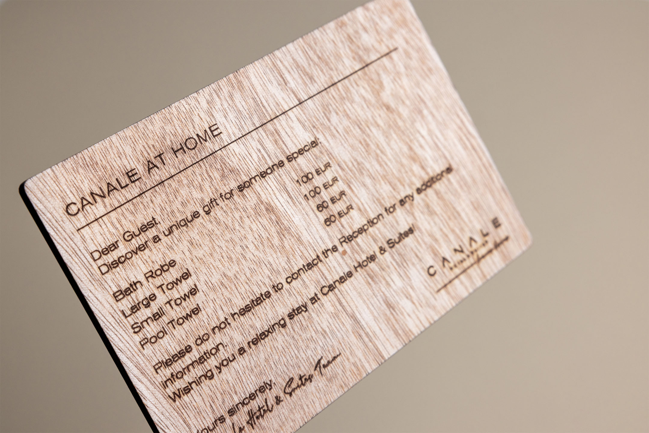 Created under a sustainable philosophy, these wooden messaging signs were designed for Canale Hotel & Suites. They match the hotel’s aesthetic, add warmth to the rooms and unlike paper, don’t need frequent replacement.