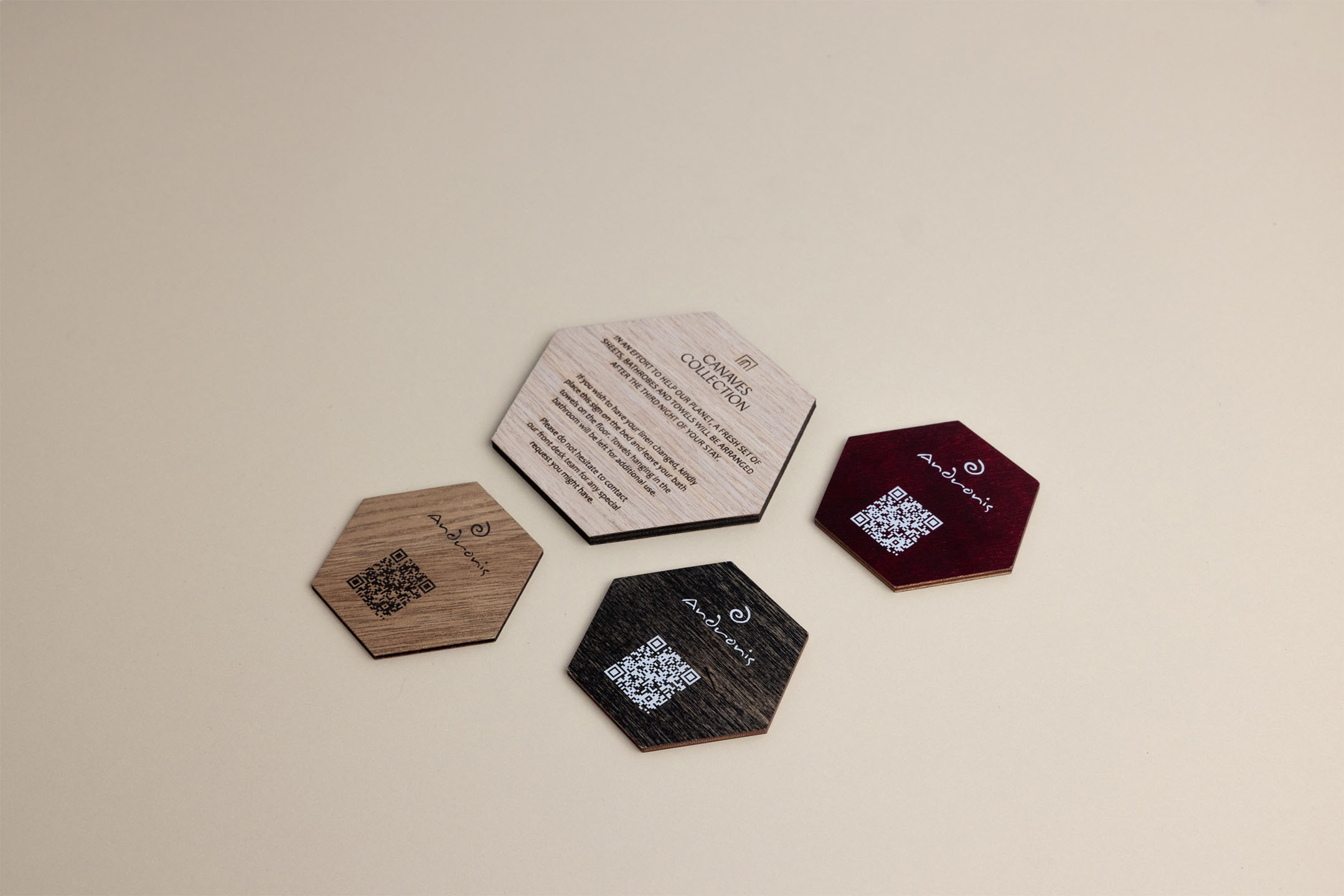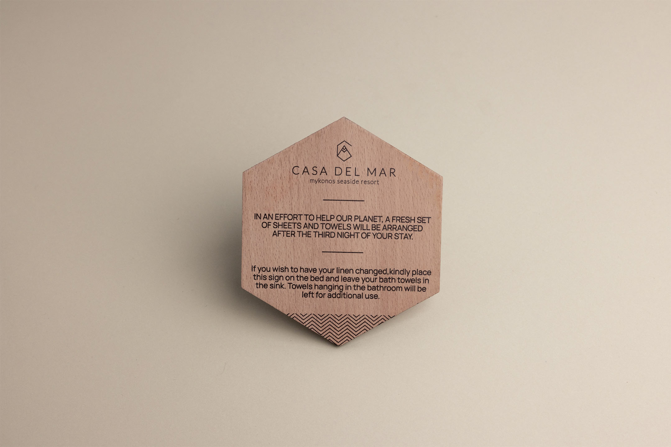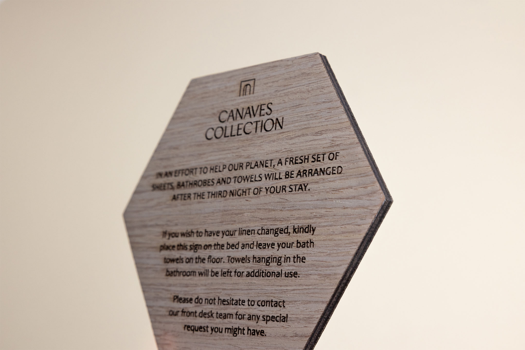 A playful wooden messaging sign shaped like a hexagon, designed to catch your guests’ eyes. Perfect for displaying short, impactful messages in hotel rooms.