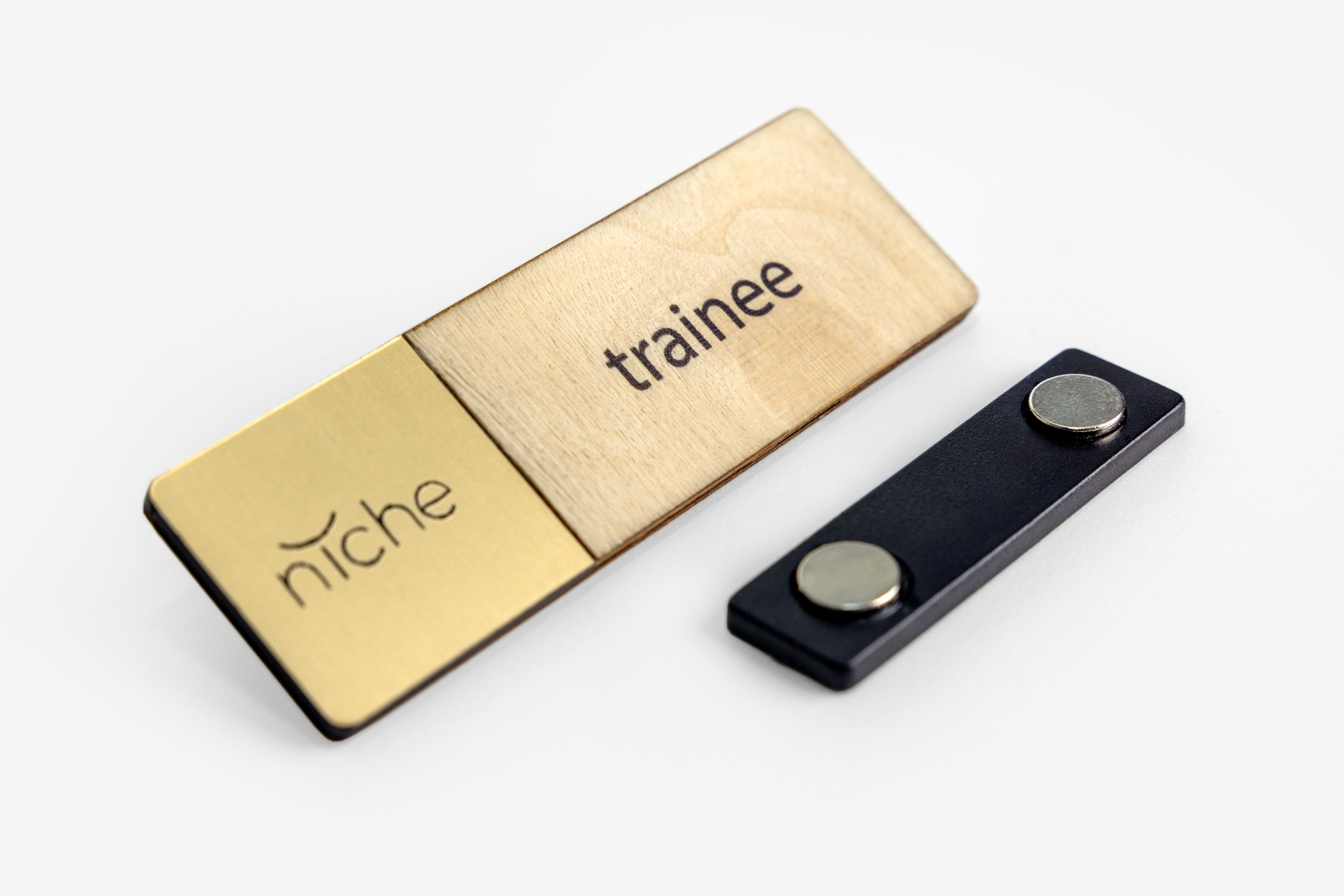 A wooden name tag with a metal detail that showcases your logo. Choose the wood tone that best suits your style for a personalised result. On the back, a magnetic clip attaches easily to clothing and stays securely in place.