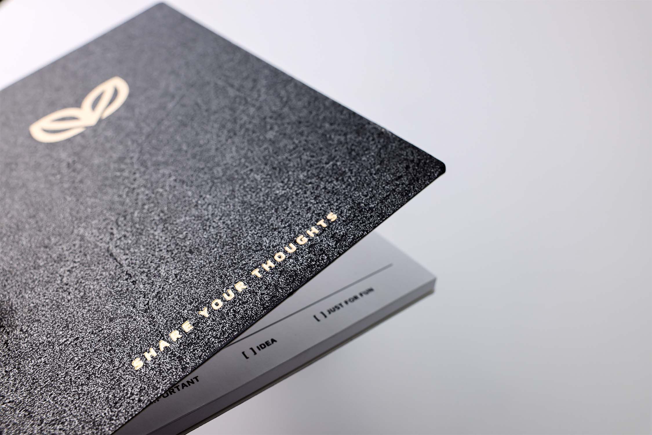 Notebook with a stone-like cover that reflects the raw beauty of rocky landscapes. We chose gold foil stamping to create a bold contrast against the deep grey tone of the premium cover paper. Inside, 80 pages can be easily removed, giving you the freedom to take notes and stay organized. A nature-inspired design that balances elegance, practicality and space for self-expression.