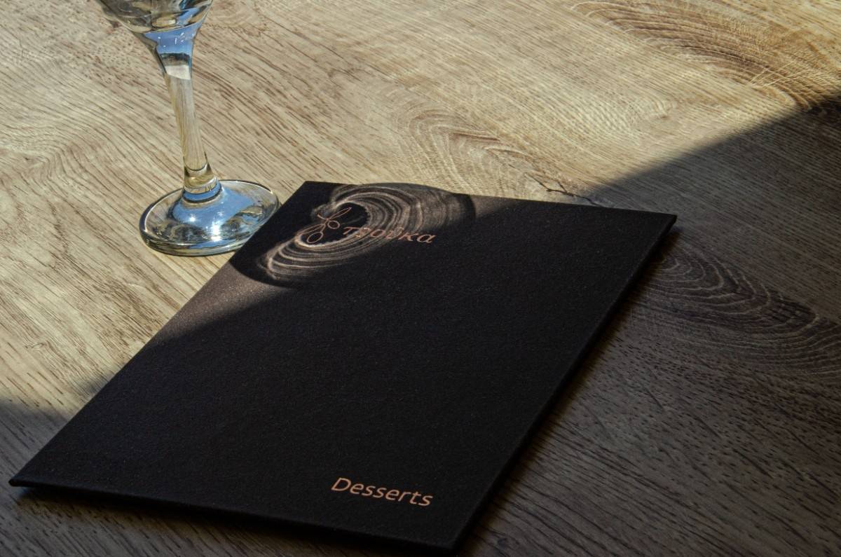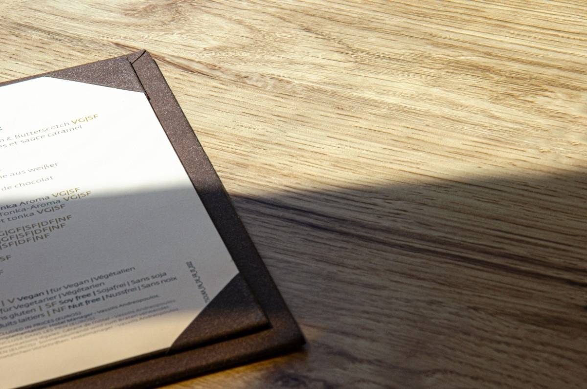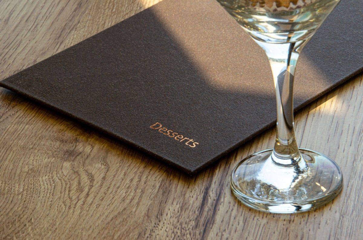 Meet our Bite-Menus series; compact-sized board menus with four corner mounts. They’re designed to showcase your desserts and breakfast items with clarity and style. Our sustainable option is for Ella Resorts. It’s dressed in recycled leather and decorated with bronze foil.