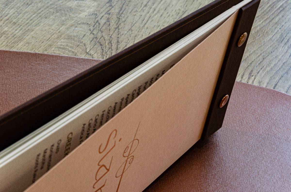 Enhance your dining journey with this menu, crafted from premium binding paper. Designed to effortlessly guide your guests through your wine and beverage selection. Select bronze foil for your logo for a shiny result.