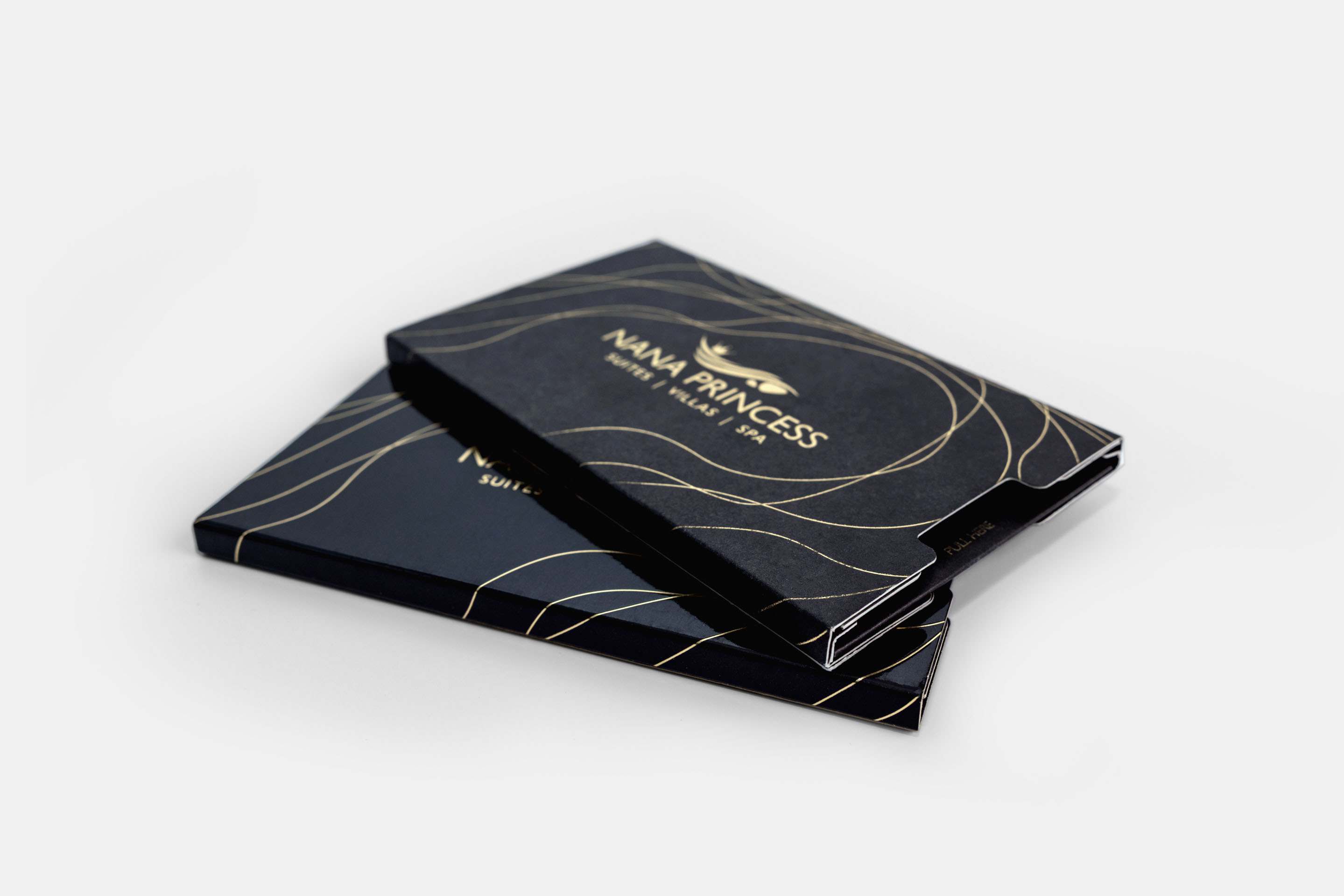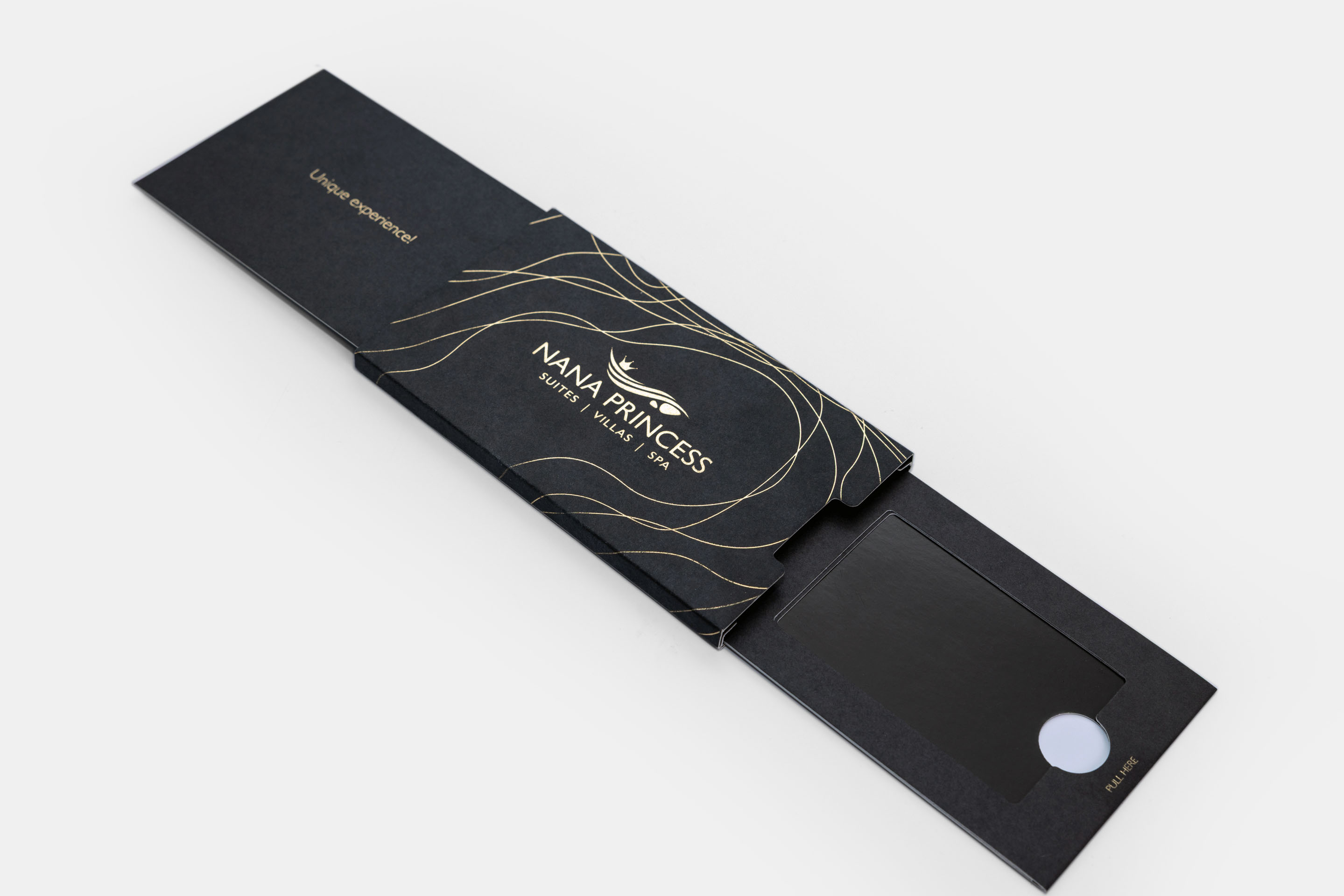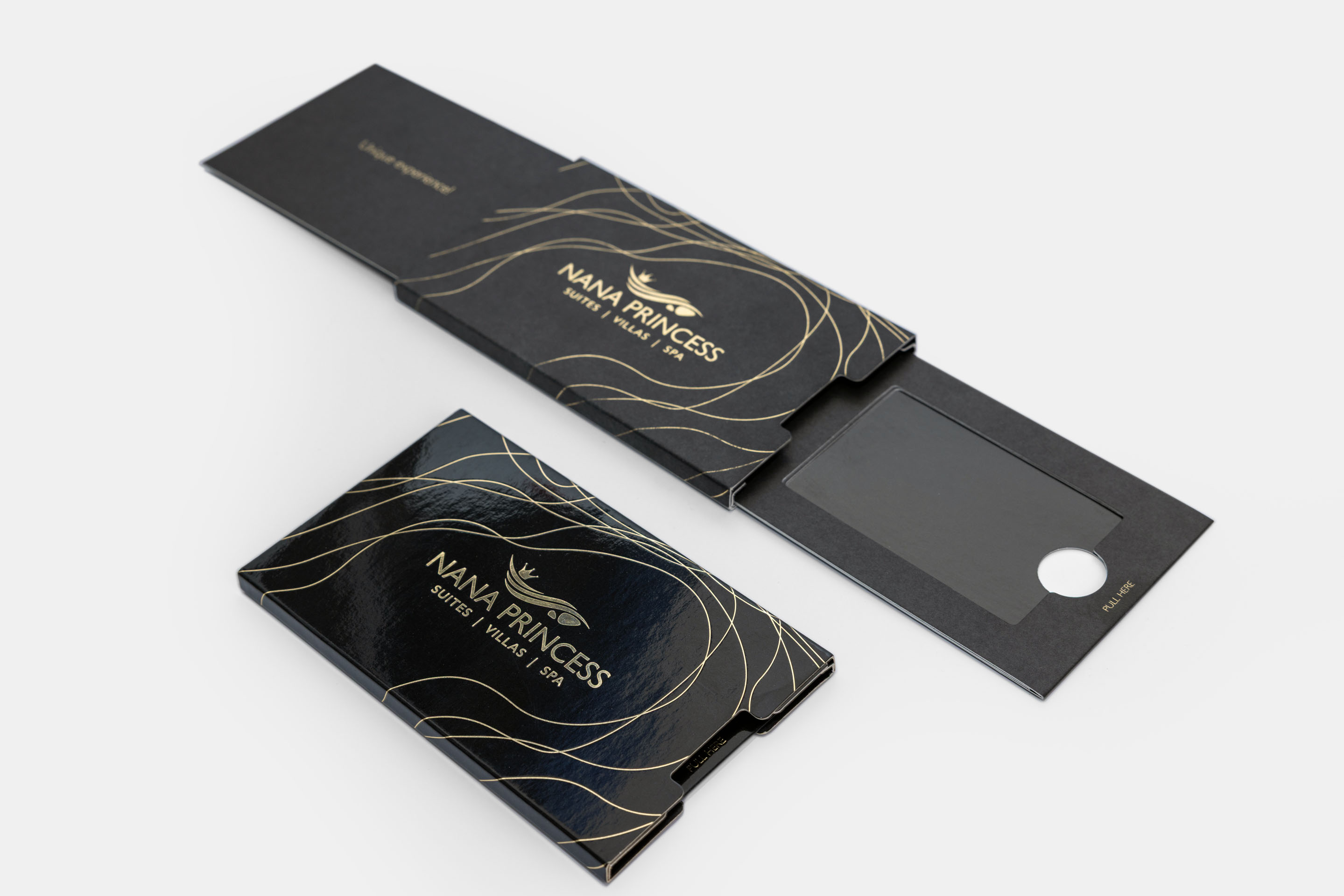 Luxury hospitality brands trust us to design and create premium products that strengthen their brand presence at every touchpoint with their guests. One example is the loyalty card presented in an elegant slide pack. As you pull, the card is revealed from one side, while your personalized message appears on the other.