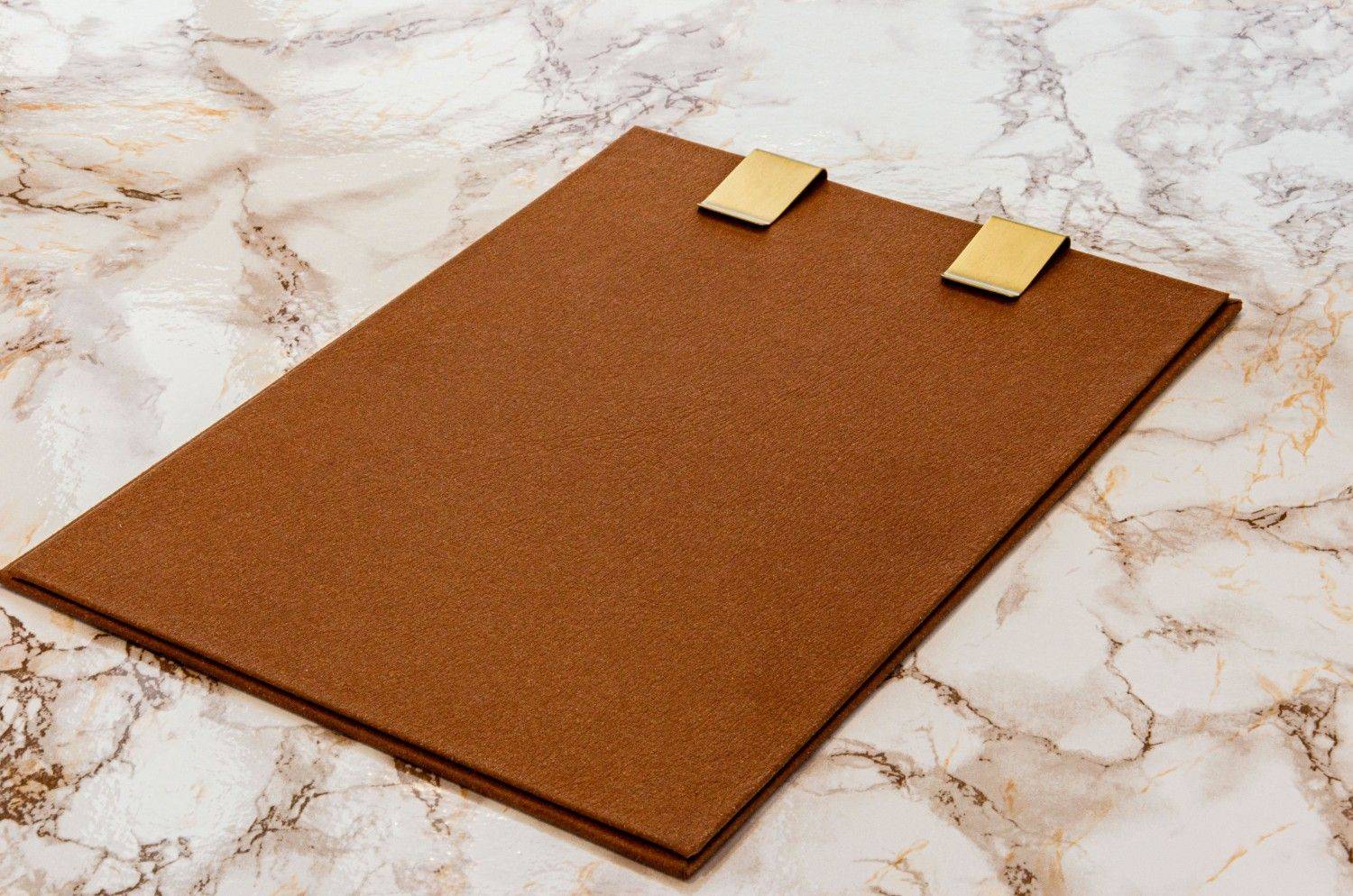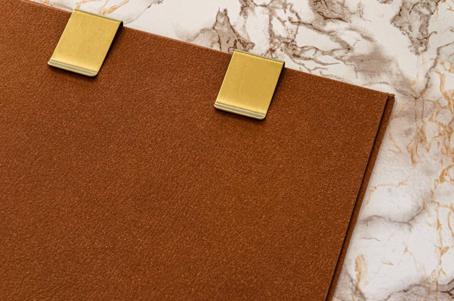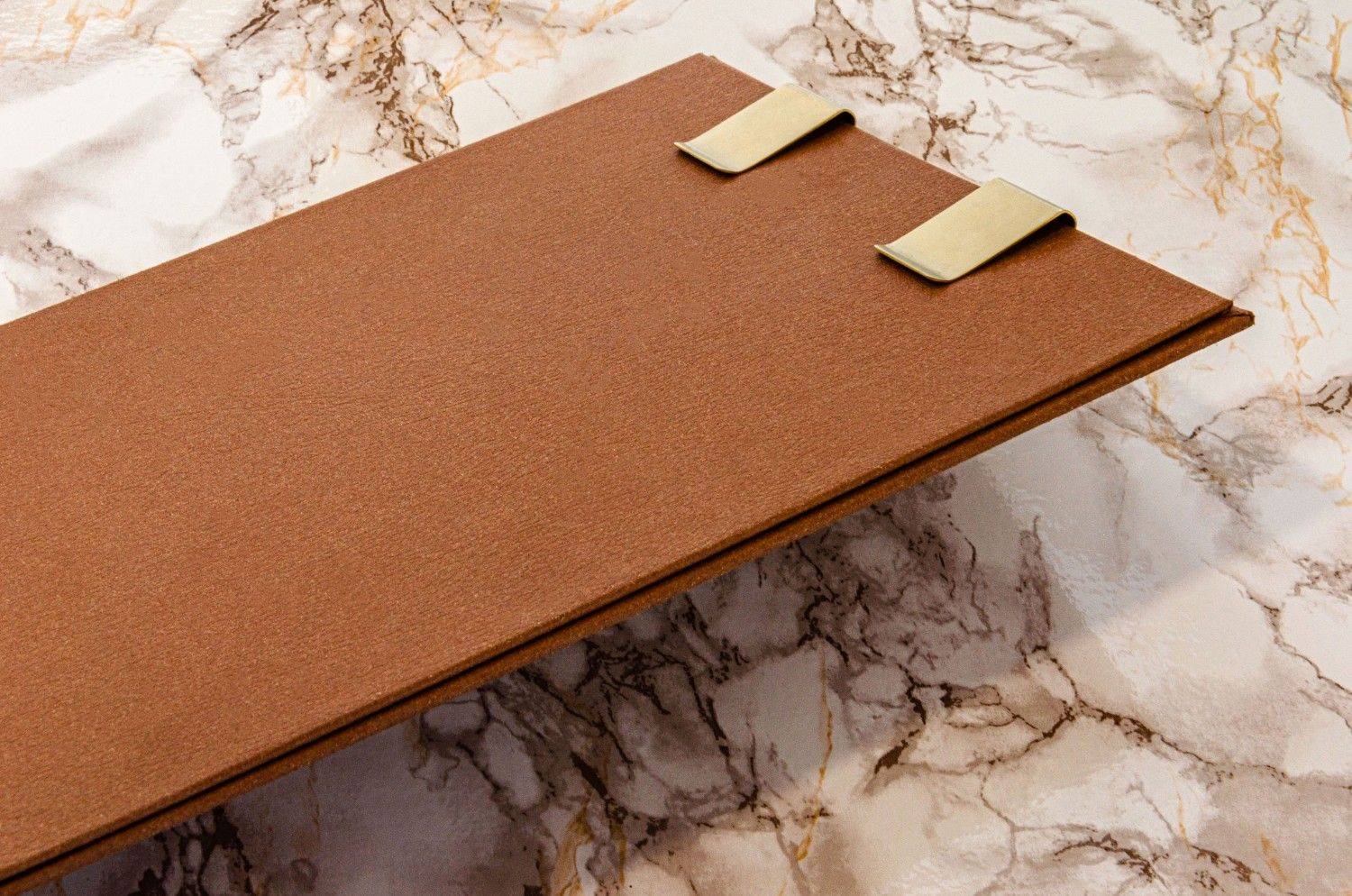 A board menu crafted from recycled leather – a bold choice that honors the environment. The two gold money clips add a touch of luxury. By selecting this menu, you prove your commitment to quality and the planet.
