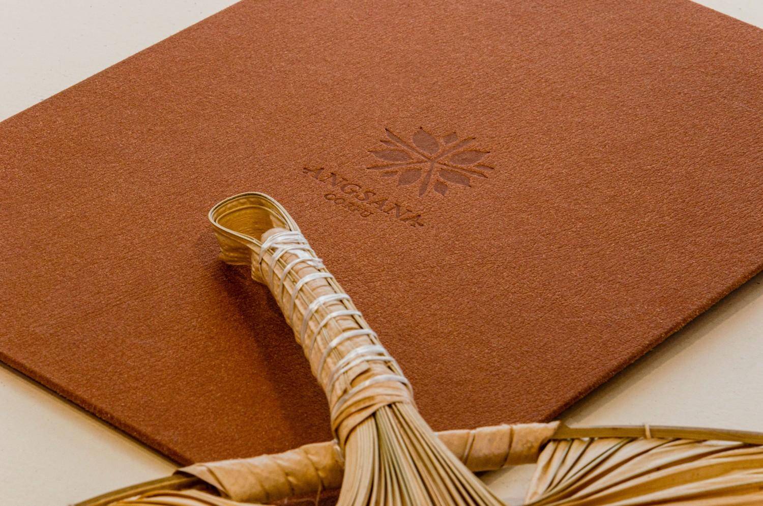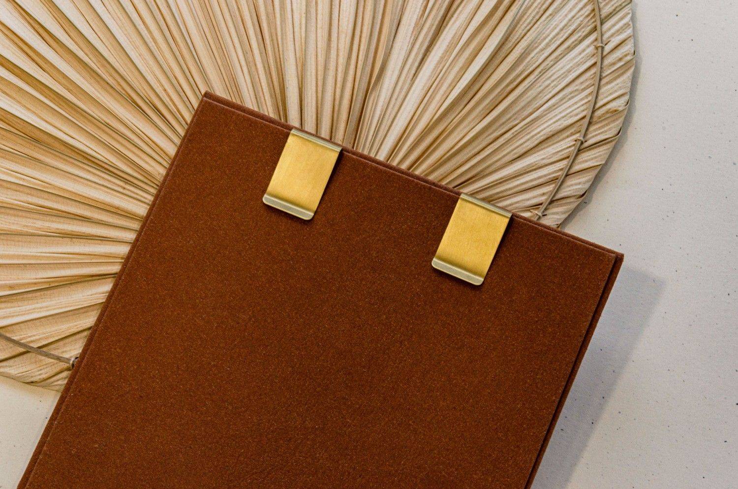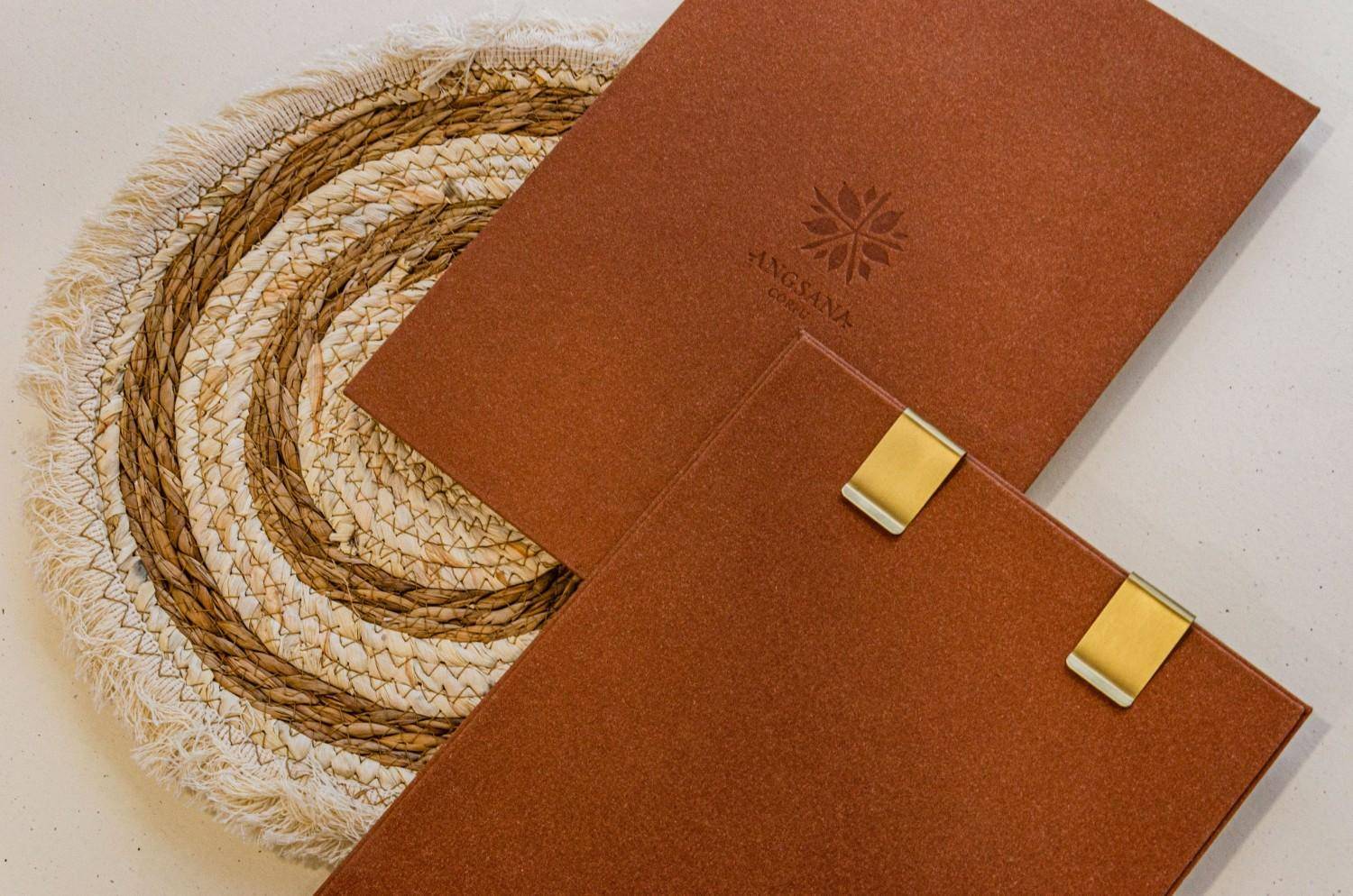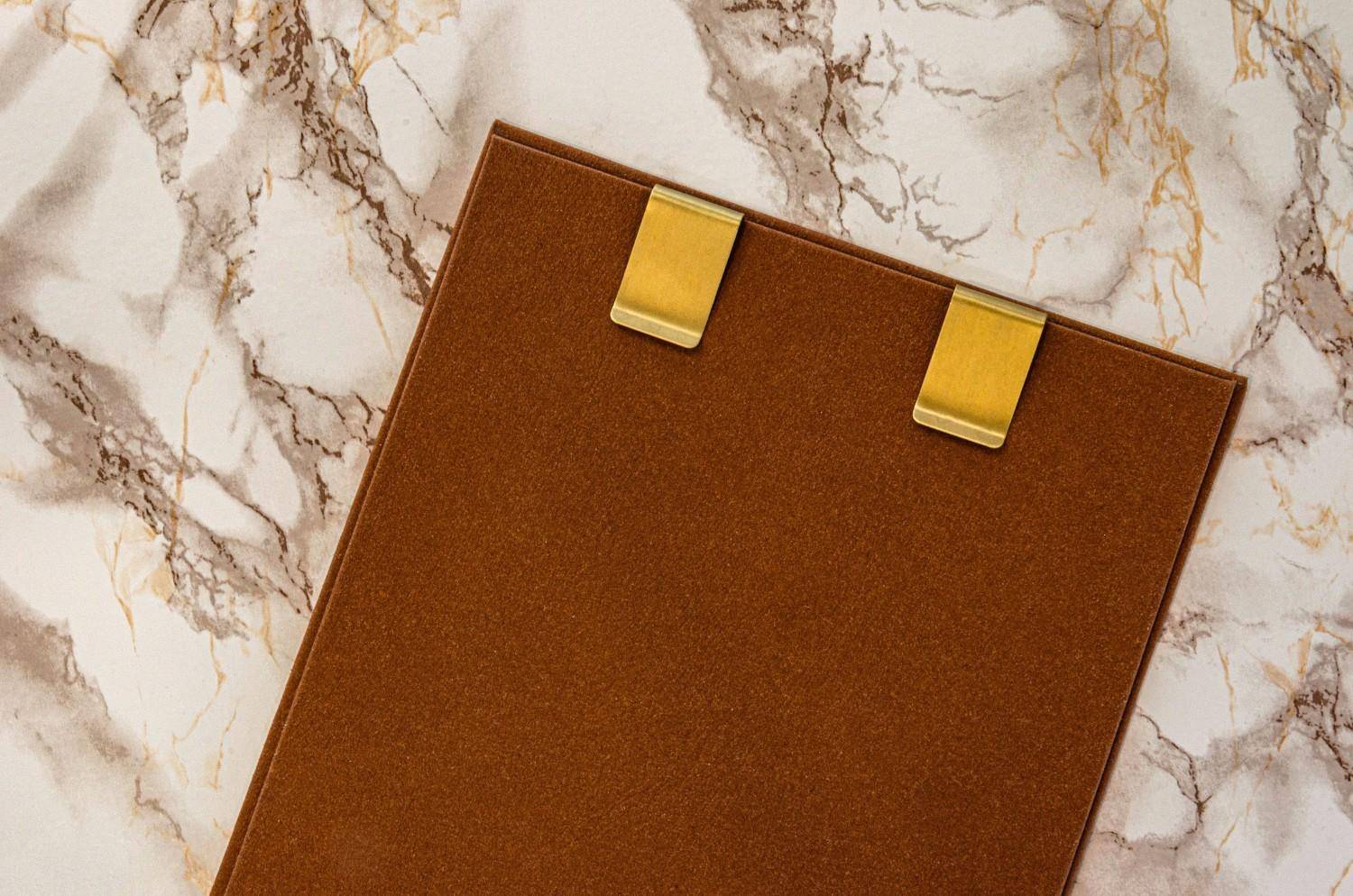 A board menu crafted from recycled leather – a bold choice that honors the environment. The two gold money clips add a touch of luxury. By selecting this menu, you prove your commitment to quality and the planet.