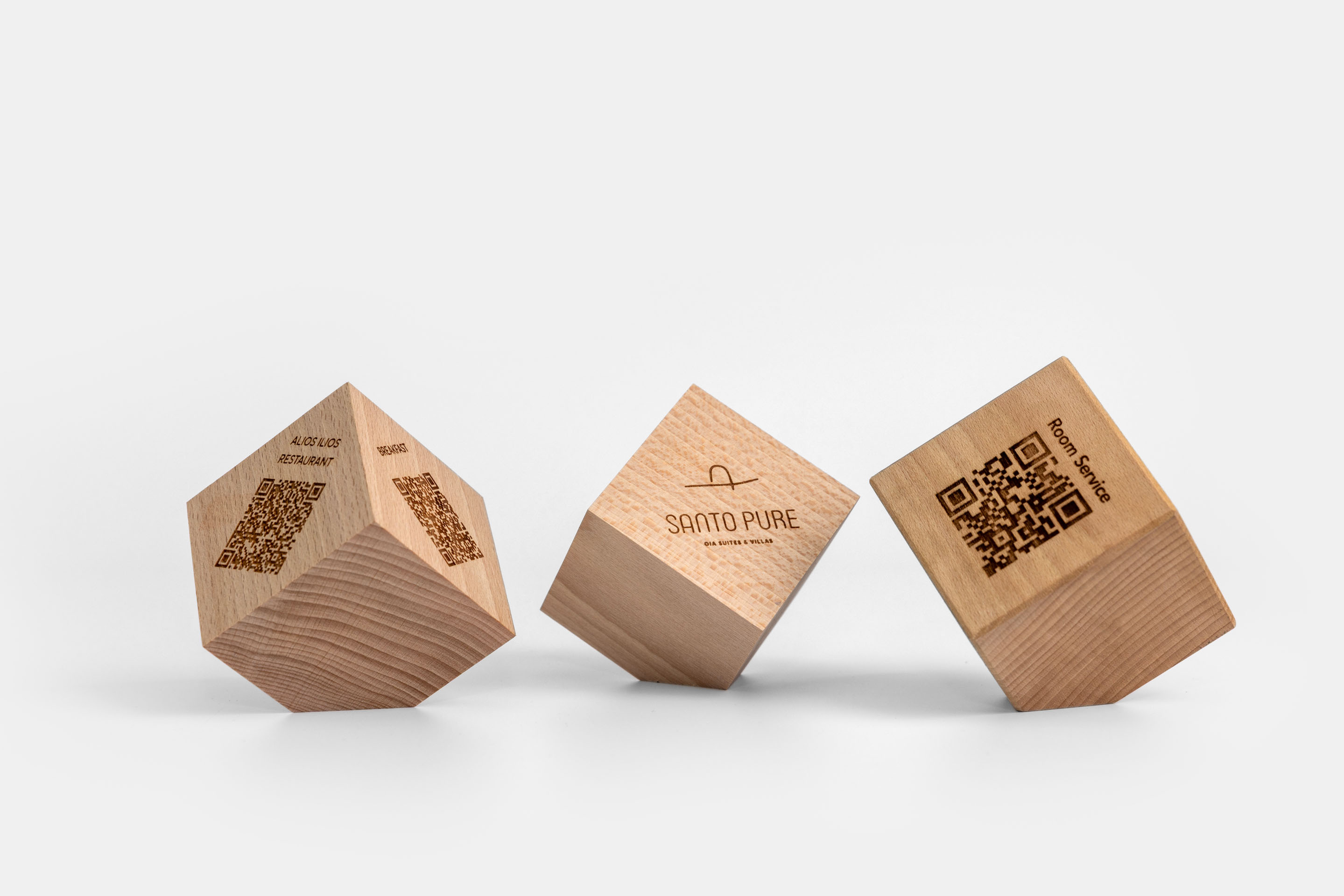 Our classic wooden QR cube displays your QR codes with practicality and clarity. Designed with a cut corner, it stands steadily on the table while making each side even more visible to your customers. Update it digitally and share your menu or any other content with ease.